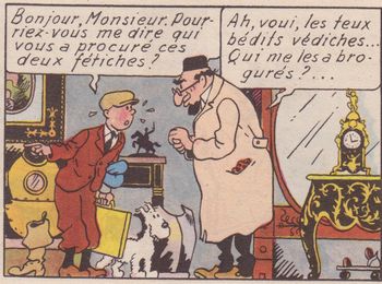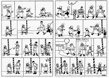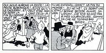remarques: | les guerres d'Hergé, essai de paranoïa-critique 1/ réponses - le Soir volé taxé même de Soir nazi par l'auteur, un homme plutôt de l'extrême gauche en comparaison avec Hergé plutôt de l'extrême droite - premier pamphlet critique sur Hergé: "le mythe Hergé" (2001) et l'auteur bien sûr n'est pas tintinophile et n'était pas un lecteur exclusif de Tintin, Spirou était tout aussi bien >> p. 9 Hergé taxé de petit bourgeois fascisant >> p. 10 l'antisémitisme, le mystère des deux juifs (voir annexe) dans le récit "l'étoile mystérieuse") devant le magazin Lévy comme présenté dans Le Soir du 11.11.1941 à noter aussi: le brocanteur juif dans la case 57 de l'oreille cassée et aussi en 1925 le dessin du juif par Hergé dans l'Effort = journal de l'association catholique de la jeunesse belge (ACJB) dont le directeur était Raymond de Becker - comparaison d'Hergé avec Louis-Ferdinand Céline (médecin et écrivain, personnnage controversé en raison de son antisémitisme et de sa proximité durant l'occupation allemande avec certains milieux collaborationnistes, il restera toutefois à l'écart de toute collaboration officielle) - et Hergé ne se serait pas gêné avec les idées des autres - Abdallah aurait été inspiré par un enfant adopté d'un lointain pays (par Hergé?) >> p. 16 le monde de Tintin est toutefois propre, aseptisé et optimiste, le seul qui se lâche, c'est Haddock - les protocoles des sages de Sion (voir plus bas information) - Simenon aurait été aussi un antisémite notoire et pro-nazi >> p. 20 comparaison entre Siménon et Hergé - en 2001, première publication par l'auteur du pamphlet "le mythe d'Hergé" qui met déjà Hergé sur la sellette - le livre "Tintin mon copain" de Degrelle paru en 2000 de façon confidentielle plusieurs années après son décès, survenu en 1994 dans lequel il déclare avoir été le modèle pour Tintin et Milou qui lui aurait été inspiré du chien d'Hitler durant la guerre 14-18 - discussions sur l'antisémitisme, les antisémites Paul de Man et son défenseur Jacques Derrida n.b. Paul de Man (1919-1983 est un théoricien de la littérature américaine d'origine belge, ami de Jacques Derrida, il a été un théoricien de la déconstruction (la déconstruction (ou le déconstructionnisme) est une pratique d'analyse de texte qui vise à révéler les confusions de sens par l'analyse des postulats sous-entendus et les omissions - il obtient son PhD à Harvard à la fin des années 1950, par la suite, il enseigne à l'université Cornell, à l'université Johns-Hopkins, à l'université de Zurich et, enfin, à la faculté de littérature française et comparée de l'université Yale où il participe au mouvement déconstructionniste - après sa mort, la découverte d'environ deux cents articles qu'il rédigea pour des journaux collaborationnistes durant la Seconde Guerre mondiale (dont certains à caractère antisémite) suscitèrent une vive controverse >> p. 26 l'émission documentaire de la RTBF (radio télévision belge francophone) en 1999 avec comme titre Madame Charles-Quint, vous avez oublié vos pistolets donnant un portrait de Maxime Benoît-Jeannin ce qui déclancha l'ire de Fanny Rodwell >> p. 29 la case parue dans Le Soir nazi en aoùt 1944 montrant Tintin en robe de chambre, lisant le journal devant une table de petit-déjeuner somptueusement garnie (n.b. vignette non retrouvée et donc non confirmée) >> p. 31 Hergé aurait découvert la bande dessinée américaine par Degrelle qui en avait envoyé plusieurs exemplaires à la rédaction du XXème siècle dans les années 20 (n.b. c'est d'ailleurs la seule vérité de Degrelle dans son livre quant à l'origine de Tintin) - MJC = maison des jeunes et de la culture - SCAM = Société civile des auteurs multimédia nomenclature: - paradigme = ensemble des termes substituables en un même point d'un discours - dénégation = action de nier, désaveu - thuriféraire = encenseur, flatteur (en littérature) - tudesque est un mot utilisé en français depuis le XVIème siècle pour désigner tout ce qui est d'origine germanique (le mot est apparenté à l'allemand deutsch et à l'italien tedesco) 2/ la résistance, quelle résistance? - la question de nommer la rue principale d'Angoulême la rue Hergé (qui fait suite à la rue Marengo), jusqu'alors seules deux communes (mais pas Bruxelles) ont baptisé une rue au nom d'Hergé: - la commune de Bierges (près de Wavre) et - la commune de Céroux-Mousty où Hergé avait élu son domicile de 1953 à 1976 - et actuellement il y a deux statues de Hergé: l'une à Angoulême et l'autre au musée Hergé près de Louvain >> p. 43 le Soir volé n'était pas une publication anodine, mais le plus important journal belge francophone de la collaboration - concernant le travail d'Hergé dans le Soir, Thierry Groenstein ne voyait en Hergé qu'un dessinateur surmené au courant de rien, alors que Jeannin le décrit comme un mercenaire dénué d'idéal humain - malgré tout, les erreurs d'Hergé étaient considérées comme vénielles par les responsables municipaux d'Angoulême (p. 45) - le récit de l'étoile mystérieuse serait selon l'auteur une histoire de propagande antisémite et pro-allemande n.b. à noter que l'auteur est un gauchiste reconnu et accuse Hergé de tendance très à droite, Jeannin traite aussi Hergé d'opportuniste, capable de travailler dans l'antre de la bête immonde tout en déclarant après coup n'avoir rien vu, rien entendu, rien compris, poussant même l'humilité jusqu'à se traiter d'imbécile - il y eut tout de même aussi des hommes de droite dans la résistance, et Hergé ne s'est vraiment jamais opposé à la collaboration, l'opinion d'Hergé: je détestais le genre résistant, je trouvais cela contraire aux lois de la guerre (déclaration d'Hergé à Henri Roanne en 1974 et que Peeters rapporte sans complaisance dans son livre) >> p. 50 cependant la glorification ininterrompue d'