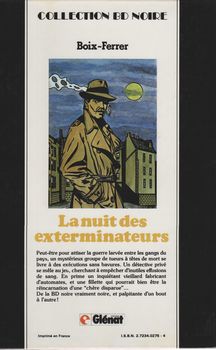 remarques: | dans la collection BD noire un détective privé, Fisher, est mandaté par un boss de la pègre pour faire cesser les règlements de compte entre truands un mystérieux groupe de tueurs à têtes de mort se livre à des exécutions sans pitié sur des truands en fait, il s'avère qu'il s'agit d'un seul homme, Vineyard, une ancienne victime d'un parrain mafioso, sa petite amie avait été torturée et assassinée par le mafioso et Vineyard a été défiguré après qu'on lui ait tranché la main droite, il s'en est malgré tout sorti et veut maintenant se venger il devient exécuteur avec un masque à tête de mort et une prothèse de la main qu'il utilise pour étrangler ses anciens bourreaux mais le mystérieux groupe de tueurs, c'est aussi l'oeuvre d'un fabricant d'automates qui a construit des robots à têtes de mort pour venger sa petite fille également assassinée par le même mafioso >> un volume également mortel à la lecture, un polar au texte sans finesse et sans originalité avec un graphisme idem sans aucun éclat, seule la couverture de l'album peut être de quelque intérêt n.b. dans la même collection, on compte toutefois l'excellente série tel Mort Cinder qui est d'un tout autre gabarit |