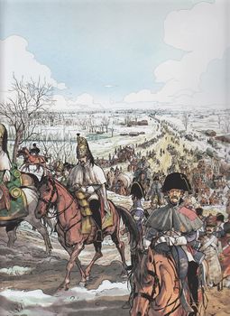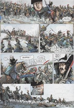 remarques: | tome 2 édition originale octobre 2016 d'après "il neigeait" de Patrick Rambaud chapitre III 1/ les décombres - au palais Petrovski, Napoleon hésite le 17.9.1812 à faire retraite, il croit encore pouvoir arranger un traité de paix avec le tsar Alexandre - en attendant il pleut à Moscou, ce qui éteint quelque peu l'incendie - le capitaine d'Herbigny et ses hommes prennent campement dans un couvent et Napoléon envoie un officier pour négocier avec le tsar tandis qu'Herbigny lance une opération au sud de Moscou à la recherche de vivres, mais ses troupes doivent se retirer lors d'une offensive d'un fort parti de cosaques >> p. 15 le sabotage d'un pont >> p. 19 le fricassée de chat >> p. 22 le suicide collectif des nonnes du couvent - Napoleon essaie de redonner vie à Moscou en y organisant des représentations de théâtre - nous sommes le 18.10.1812 - Roque est toujours amoureux de la comédienne Ornella >> p. 27 apparition de la première neige escarmouche entre les dragons de Murat et les cosaques > p. 31 les vaguemestres (= sous-officier chargé du service postal) 2/ marche ou crève! - 19.10.1812 la retraite commence par un temps radieux >> p. 39 la traversée des marécages de la Nara >> p. 38 la défécation de M. Sautet - la retraite vers Smolensk par la route la plus courte >> p. 42/43 retour à travers le champ de bataille de Borodino, l'homme dans la carcasse - 9.11.1812 arrivée à Smolensk où Napoleon apprend le complot du général Malet à Smolensk, les vivres manquent et sur le chemin du retour, les charrettes sont souvent abandonnées y compris avec les blessés >> p. 51 l'artillerie sur traineau de l'armée russe - on n'a plus le temps ni de se laver ni de se raser, mais Napoleon dispose encore de son fourreur-cordonnier personnel et la retraite continue à se traîner >> cette deuxième tome n'est plus à la hauteur de la première, l'action se traîne aussi selon l'itinéraire de la carte mentionnée en fin d'album, toutefois le graphisme de Gil reste toujours encore respectable, suite et fin dans un troisième et dernier volume qui paraîtra en 2017 |