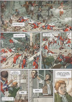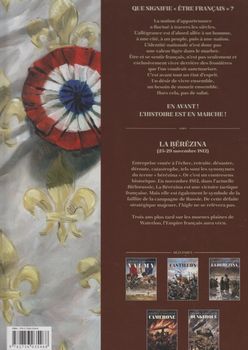 remarques: | à noter: cet album no 3 fait partie de la collection champs d'honneur, une collection qui n'a rien à voir avec la série Bérézina de Gil+Richaud d'après l'oeuvre de Patrick Rambaud - août 1782, au palais des Tuileries, la garde suisse se fait massacrer, un officier de la garde réussit à mettre son fils à l'abri en lui rappelant la devise de sa famille: "dragons, manticores, vouivres, je combattrai, la peur de mon âme, je chasserai" - décembre 1805, Austerlitz, un rescapé de la garde du roi, Amaury de la Buissonière, combattant au côté des autrichiens, est soigné par le médecin de la garde de Napoleon, le docteur Berget >> p. 14 les bienfaits de la Révolution qui a amélioré les soins médicaux grâce entre autre aux recherches du dr. Berget - Tilsit 1807, tentative de paix entre l'empereur et le tsar >> p. 36 le maréchal Koutousov n'est pas encore tout à fait borgne - juin 1812 la Grande Armée entre en Russie (600'000 hommes, 1000 canons et 200'000 chevaux) Borodino, 7.9.1812, la route de Moscou est ouverte - 19.10.1812 départ de Moscou, la retraite est continuellement harcelée de toute part,notamment par les cosaques de Platov - les chevaux n'ont plus rien à manger et tombent comme des mouches, arrivée à Smolensk le 9.11.1812 par une grande froidure et il n'y a pratiquement plus de vivres - les français sont arrêtés à Borissov, les ponts coupés et la rive occidentale occupée par les russes, toutefois Napoleon réussit à tromper l'armée du tsar en traversant la Bérésiza en amont à Stoudienka; il y aura de grande pertes du côté français, mais le coeur de la grande armée échappe à l'anéantissement >> un récit peu intéressant tant par le graphisme que par le texte, il n'y a en outre aucune information documentaire par contre, les dernières pages contiennent de la publicité pour les autres ouvrages de cette collection (champs d'honneur), rédigés par le même scénariste avec différents dessinateurs dont les albums: - Valmy 1792, victoire de la République (tome 1) - Castillon 1453, fin de la guerre de Cent Ans, victoire française grâce à l'emploi de l'artillerie mobile (tome 2) - Camerone 1863, une page de gloire par la Légion Etrangère (tome 4) avec sa devise "honneur et fidélité" - Dunkerque 1940, une défaite, mais une glorieuse évacuation (tome 5) n.b. Bérézina fut le synonyme de déroute ou catastrophe, en fait ce fut une victoire tactique malgré la faillite complète de la campagne de Russie |
