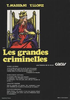 remarques: | description de quatre criminelles 1/ Marie Lafarge (1816-1852) orpheline, adoptée par le baron Cappelle, c'est une jeune femme moderne qui se marie en 1839 avec Charles Lafarge, un bourgeois campagnard, celui-ci, en mauvaise situation financière, dilapide la fortune de son épouse qui dégoûtée de Charles l'aurait empoisonné avec de l'arsenic Marie Lafarge, après plusieurs années de détention, est grâciée par Napoleon III et meurt prématurément vieillie en 1852 en proclamant son innocence 2/ l'affaire Steinheil (1869-1954) l'histoire de Marguerite Japy, née en Alsace, elle se marie très jeune à Paris au peintre Adolphe Steinheil et fait de leur demeure le rendez-vous du tout Paris, elle sera surnommée "la belle Meg" et deviendra même la maîtresse du président Félix Faure; à la mort de celui-ci, la renommée de la maison Steinheil s'estompe n.b. mentionné dans la presse: émotion à l'Élysée, le président de la République est mort dans les bras de sa maîtresse cela s'est passé le 16 février 1899... Meg sera soupçonnée d'avoir tué son mari pour pouvoir prendre un amant, mais sera après coup acquittée et part pour l'Angleterre où elle épouse le riche lord Abinger le mystère du meurtre du peintre Steinheil ne sera jamais élucidé 3/ Violette Nozière (1915-1966) surnommée l'empoisonneuse du siècle en 1933, elle prend comme amant Jean Dabin et pour lui procurer de l'argent, elle aurait empoisonné son père et sa mère condamnée à la prison à vie en 1934, curieusement elle est réhabilitée en 1963 et libérée, mais à sa mort, elle fait brûler par sa fille une petite valise verte contenant son secret surnommée "l'ange noir", son histoire sert de trame au film Violette Nozière, réalisé par Claude Chabrol en 1977 4/ Pauline Dubuisson (1927-1963) à Dunkerque en 1941, son père utilise le charme de Pauline pour collaborer avec l'occupant, Pauline devient la maîtresse d'un colonel allemand à la libération, elle est tondue par la résistance, mais aidée financièrement par son père, elle continue des études de médecine eet aura une relation avec un étudiant en médecine qui plus tard la repousse, alors elle tue son amant avec un revolver et tente de se donner la mort mais échoue elle est condamnée à la prison à vie en 1953, libérée sous condition en 1959, elle se suicidera cette fois pour de bon après une affaire passionnelle qui aura mal tourné connue comme la "Messaline des hôpitaux", son histoire fera l'objet du film "la vérité", son rôle interprétée par Brigitte Bardot >> 4 "petites" grandes criminelles pas très connues, mais qui ont existé (description plus détaillée dans internet) texte et graphisme de médiocre fracture, mais curieusement un album bien côté au BDM |