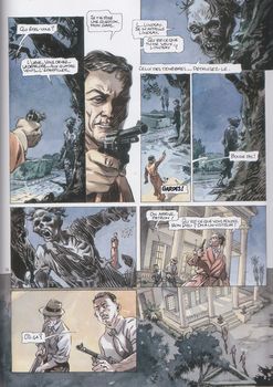 remarques: | introduction 1928, des pilleurs de tombes en Louisiane, déterrent le cadavre d'Henry Lindsay, mais le cadavre leur échappe! quelques mois plus tard, Nouvelle-Orléans, trafic d'alcool en pleine période de prohibition, guerre entre truands, le gang Gordon Devries contre le gang du Temple dirigé par Drake et Viper (genre Bonnie and Clyde) lors de l'attaque d'un convoi de whisky, le gang Temple découvre des cadavres dans des caisses de bourbons, ce seraient un genre de momies provenant d'un musée et Gordon Devries veut maintenant la peau de Drake et Visper mais Devries a aussi des problèmes avec sa première femme décédée qui lui manque et avec son fils Jeff qui n'en fait qu'à sa tête >> p. 37 comme punition, le fils prodigue est enfermé dans le caveau mortuaire de la famille fin de l'épisode, Gordon Devries essaie de se consoler avec le livre Necromancy >> à la Nouvelle Orléans en 1928, un homme règne sur les vivants mais d'entre les morts viendra sa chute une histoire de gangsters couplée avec l'apparition de morts-vivants (des walking dead?), le texte prête quelque peu à confusion, mais le graphisme est superbe avec une jolie couverture d'album Information le réel et le fantasque, deux éléments antinomiques et pourtant complémentaires, l'alchimie qui lie ces deux facettes d'une même réalité doit autant à la science du découpage de Fabien Nury qu'à la maîtrise parfaite affichée par Jack Manini, déjà remarqué sur la série Estelle, ce dessinateur qui signa également le scénario de La loi du Kanum accompagne très bien les changements de lieu et d'ambiance dont est truffé le récit, par l'alternance de séquences fort aérées, se déroulant à la lumière du jour, et d'autres, plus sombres, qui soulignent les ombres et dissimulent les dangers, il confère une tension supplémentaire à une histoire dont la teneur donnait déjà des frissons dans le dos, la complémentarité entre les deux auteurs, palpable, donne donc naissance à une œuvre forte, riche, complexe, qui convie le lecteur à redoubler d'attention pour en saisir les finesses n.b. ce que le lecteur ne veut peut'être pas vraiment |