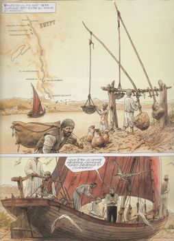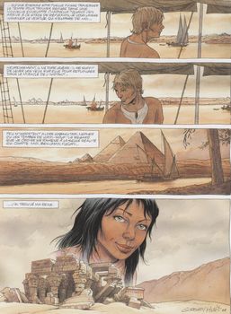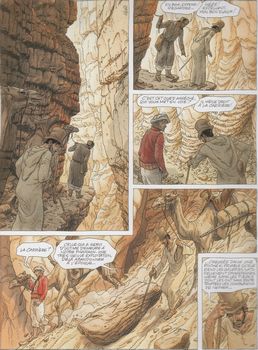 remarques: | la suite sur la recherche de Aurore Beauchamp et exploration de la nécropole du pharaon inconnu Nepher avec passage obligé à l'hypostyle (salle des offrandes), à la fausse fausse-porte et à la chambre sépulcrale la quête pour le pharaon inconnu vallée du Nil, 1834, Benjamin est bien décidé à retrouver Aurore >> p. 9 l'histoire du pharan inconnu Nepher et de son épouse Sabakhtari (semblable à celle du pharaon Akhenaton et de son épouse Nefertiti), elle et lui voulurent crééer une nouvelle philosophie humaniste et religieuse ce qui leur attira la haine des prêtres et ils furent tous deux assassinés Benjamin et ses compagnons arrivent assez vite sur les lieux des fouilles où ils découvrent la campement d'Aurore mais point trace d'Aurore et de son guide Gamal et ils ont déjà été repérés par des pillards >> p. 19 l'arrivée sur le site de la nécropole après avoir repoussé l'attaque des pillards, Benjamin et Laroque s'engagent dans la galerie de la nécropole, tous deux arrivent à une hypostyle = salle des offrandes, puis à une fausse-porte qu'ils arrivent à ouvrir mais ils se retrouvent séparés, Benjamin continue seul et finit par découvrir Aurore, inanimée dans la chambre sépulcrale, mais Benjamin ne peut plus revenir sur ses traces, un mécanisme secret ayant fermé l'entrée de la chambre >> p. 30 la fausse fausse-porte qui devient une vraie porte heureusement la cavalerie du colonel Beauchamp arrive à la rescousse et après avoir éliminé les pillards, ils parviendront à délivrer Benjamin et Aurore de la chambre des morts, toutetois de retour à l'air libre, un cataclysme fait écrouler la montagne ce qui rend toutes recherches impossibles à l'avenir, le tombeau de Nepher et Sabakhtari restera inviolé et tout est bien qui finit bien >> si le graphisme de Hulet est toujours très respectable, le scénario de Fleury-Nadal est quelque peu banal avec toutefois une action soutenue, on y retrouve quelques nettes allusions au mystère de la Grande Pyramide de Jacobs >>> un graphisme mais scenario quelque peu banal, par contre nette référence à l'album II "mystère de la grande pyramide" de Jacobs |