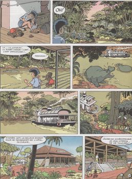 remarques: | édition 1989 mais 2ème réédition Jimmy et Schatzenbaum sont arrivés en Afrique et y retrouvent Zoko, le fournisseur des araignées "spongei" mais celui-ci a déjà été éliminé par la bande de Benjamin Griff >> p. 5 l'assassinat par poignée de main de poil d'araignée retrouvailles avec Hermann, le lion mascote de Schatzy >> p. 11 un cuisinier mis beaucoup à contribution et la statuette de serpent en bois d'ébène, seul héritage de Jimmy - en route pour Banania, mais Schatzy part seul, Jimmy de son côté fait des recherches sur la disparition de ses parents - Jimmy découvre que ses parents ont été assassinés pour d'obscures raisons racistes par un certain van den Wijngaert qui est aussi sur les traces de Schatzy et des araignées >> p. 16 présentement un bon marchandage - les antagonistes se retrouvent dans l'atelier de la mort, Wyngaert, après avoir avoué qu'il est l'assassin des parents de Jimmy, veut éliminer Jimmy qui est sauvé par le lion Hermann, van Wyngaert meurt par la piqûre de l'araignée spongei >> p. 39 dissertation sur l'araignée iquifus spongei >> p. 47 la mort de Wyngaert dans l'atelier de la mort = le repaire de l'araignée spongei - le secret de la valeur de l'araignée est finalement révélé, c'est une araignée dotée d'un poison foudroyant qui ne laisse aucune trace et qui vaut une fortune pour certains services secrets et la statuette du serpent d'ébène servait comme signe de ralliement pour un cercle de blancs africains >> toujours un album respectable tant pour le scénario, teinté de quelque humour, que pour un admirable graphisme de Desorgher |