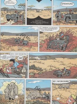 remarques: | édition originale, dédicacée par Desorgher - les nouvelles aventures de Jimmy Tousseul dans le nouveau domaine aménagé comme réserve animale par Schatzy Schatzenbaum - arrivée de deux premières touristes dont la jeune fille Helène qui n'a pas bon caractère mais qui s'entend avec Jimmy >> p. 26 les relents du colonialisme Jimmy retrouve Napoleon M'bula et son père qui est devenu président d'un état africain coup de théâtre, le président M'bula est assassiné et Jimmy avec Napoleon échappent de peu aux assassins de son père dont Wyngaert, rescapé des morsures de l'araignée spongei règlement de compte durant lequel Blanpain, chef des colonialistes balncs, trouve la mort mais avant de mourir, il révèle à Jimmy que son père est encore vivant >> p. 41 la course-pousuite dans la jungle avec une ancienne Peugeot 203 et c'est Napoleon qui cette fois mène la danse! >> un épisode africain à rebondissement, au scénario teinté de racisme et colonialisme, un peu moins recherché mais toujours un bon graphisme de Desorgher |