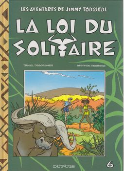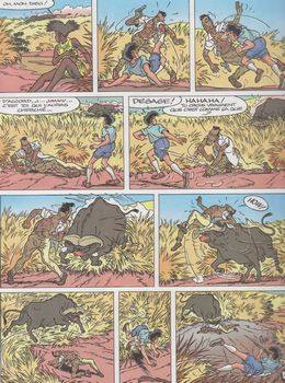 remarques: | introduction une jeune fille noire se fait maltraité par un jeune fils à papa métis Jimmy n'est pas rentré en Europe mais il doit maintenant fréquenter les cours d'une école africaine >> p. 9 l'école africaine >> p. 14 le professeur d'histoire Jimmy se prend de bec avec Valentin Makongo, le fils à papa >> p. 22/23 la course de voiture entre les 2 jeunes gens n.b. à noter une région africaine bien pourvue de voitures américaines des années 1950-1960 Valentin perd la course et se fait réprimander par son riche père qui le traite de vaurien et le met au défi d'affronter un buffle solitaire >> p. 45/46 le combat avec le buffle qui se retire blessé mais pas achevé Jimmy sauvera la vie de Valentin tout en lui sauvant aussi son honneur, Jimmy y gagnera en contre-partie les faveurs de la belle noire Lana >> un album bien musclé mais avec un scénario assez lourd, avec un graphisme acceptable, le climat, tout comme le graphisme, reste toujours bien africain et le scénario est cette fois très moralisateur |