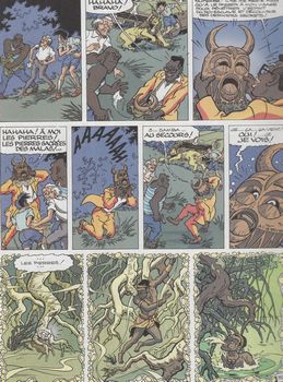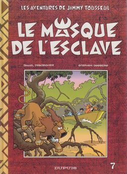 remarques: | édition originale avec ancienne couverture Jimmy sauve une jeune fille noire de la noyade et découvre par la même occasion une grotte mystérieuse, lors de ses recherches, Jimmy tombe sur un charlatan qui lui fait découvrir les secrets de la caverne qui servait de refuge à des noirs destinés à l'esclavage Jimmy se lance alors avec l'explorateur Cramer sur les traces d'un soi-disant trésor caché par le roi-esclave mais Gwandi, le père de Valentin, est aussi sur cette piste >> p. 8 façe au masque de l'esclave >> p. 12 à Kasabubu, les blancs sont encore appelés "patron" >> p. 17 la boutique du charlatan africain >> p. 20 la condition féminine de l'africaine n'as pas encore très évoluée à Kasabubu - après plusieurs efforts de part et d'autre, c'est Gwandi qui met le premier la main sur le fameux masque et en l'endossant, il peut voir mentalement où est caché le trésor, mais une fois le trésor récupéré, Gwandi ne peut plus se débarrasser du masque et meurt étouffé >> p. 33 l'histoire du roi-esclave "car celui qui passera le masque sur sa tête sera pénétré par l'esprit du roi et le chemin des diamants lui sera révélé" mais la dangereuse fonction du masque n'est pas mentionnée! >> un histoire assez originale avec la vengeance du roi-esclave malgré les dialogues super naïfs de Jimmy pour s'attirer les faveurs de la belle Lena, le graphisme reste acceptable |