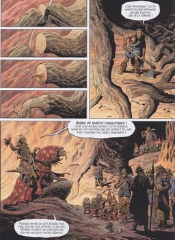 remarques: | Louve veut se rendre à Bag Dahd à la recherche de Thorgal >> p. 6/7 petit cours sur les neufs mondes de la mythologie nordique: - Yggdrasil, l'arbre sacré d'Odin, qui, avec ses racines géantes, protège Asgard, le monde des dieux Ases, monde d'en haut - Vanaheim, le monde des dieux Vanes (un autre genre de dieux) - Mitgard, le monde des hommes, monde du milieu - Swartalfheim, le monde des alfes noirs (sous les racines de Yggdrasil) - Nidavellir, le monde des nains - Jötunheim, le monde des géants - Muspelheim, le monde du feu, des êtres de lave - Niflheim, le monde des brumes et des niebelungen - Helheim, monde des morts réapparition du nain Tjahzi qui recherche aussi Thorgal pour éviter le chaos des mondes, en l'occurence arrêter l'action de la reine des Alfes noirs qui veut détruire Yggdrasil, un frêne géant, en tranchant ses racines et ainsi provoquer le chaos des mondes s'en suit une série d'épisodes où interviennent des personnages plus ou moins connus dans les aventures de Thorgal dont le nain Tjahzi ainsi que - la guenon (une nixe) appelée Jasmine >> p. 11 vite ou pas si vite - l'ex-gardienne des clés - la déesse Frigg qui intervient sur Vigrid, le demi-dieu destitué, qui prend de jour la forme d'une araignée - Lolth, la reine des Alfes noirs qui demande l'aide du magicien Azzalepstön (pour travailler le métal qui n'existe pas et qui seul permet de trancher les racines de l'arbre Yggdrasil) - du soudard exilé Volsung de Nichor - du serpent géant Nidhogg qui protège l'arbre sacré Yggdrasil Louve et Trahzi veulent convaincre le serpent Nidhogg de reprendre son rôle de gardien de l'arbre sacré car il est l'unique être qui peut vraiment protéger les racines d'Yggdrasil >> et à part Thorgal, tout le monde recherche tout le monde dans cet album au déroulement également chaotique, le scénario est vraiment mythologique mais reste amusant, tout comme le graphisme de Surzhenko bien exécuté annexes - couverture de l'album - les racines de l'arbre Yggdrasil - Louve, la petite guerrière |