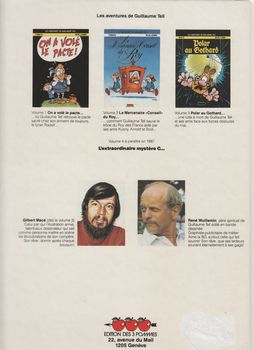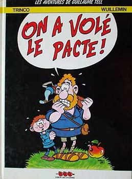 remarques: | titre complet: les aventures de Guillaume Tell chez Guillaume Tell et son fils Pom au Koekenpick, les suisses organisent une conférence de la paix >> p. 14 le tell-est-féérique Radolf, le méchant seigneur voisin, n'est pas invité à la conférence et se venge en fomentant un attentat sur Guillaume Tell, l'agent 0,7 pour mille et sa compagne Lolita enquêtent la conférence n'est accessible qu'à ceux qui portent une vignette >> p. 32 la réception pour Bigreag et Grobadchev mais d'abord il faut se débarrasser des brigands sur la ligne du Gothard c'est la bande de Fadaki qui terrorise la région grâce à Tell, l'ordre est rétabli au Gothard mais sur le chemin du retour, Tell a disparu dans la faille du diable la suite dans le prochain album: l'extraordinaire mystère C >> les aventures moyenâgeuses et humoristiques de Guillaume Tell cet album no 3 collectionné comme exemplaire représentatif de la série, un scénario avec texte sans grande prétention à part quelques gags suisses, mais un graphisme acceptable de Macé qui a repris le pinceau du dessinateur Trinco depuis les deux premiers volumes tome 1: on a volé le pacte (1984) où Guillaume Tell retrouve le pacte sacré chez son ennemi de toujours: le tyran Radolf 2/ le mercenaire "conseil" du Roy (1987) comment Guillaume Tell sauve le trône des Francs aidé par ses amis Kuony, Arnold et Scot il y aura encore 6 autres albums dans cette série: tome 4 l'extraordinaire mystère C (1987) tome 5 Rocvache (1989) et dans les éditions Dargaud: tome 6 Choc-Ness (1990) tome 7 fichus fichiers (1991) tome 8 Euroka (1993) tome 9 dans le mille (1994) |