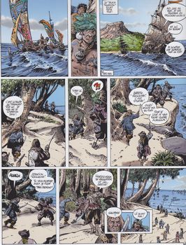 remarques: | la suite des aventures flibustières d'Andrew, un comptable du XVIIème siècle dans les Caraïbes retour sur l'île de nulle part où nos amis sont assaillis par des sauvages, genre papou >> p. 7 "Pas-de-Quartiers", le capitaine pirate, alias l'homme rouge, qui allait devenir une légende en mettant en fuite les papous tandis que Andrew découvre le trésor caché de Pas-de-Quartiers dans une grotte sous-marine un peu plus tard, deux navires-pirates débarquent sur l'île à la recherche du trésor, Andrew et ses acolytes renouvellent leur coup en s'emparant d'un bateau des pirates et en canonnant l'autre navire laissant le chef des pirates et son équipage abandonnés sur l'île mais après avoir erré sans but sur les mers, Andrew retourne à son île paradisiaque où entretemps les pirates ont été massacrés par les sauvages-papous qui attendent maintenant de nouveaux arrivages >> dernière page: le comité de réception papou >> des nouvelles aventures de pirates où Franz s'en donne à coeur-joie, un scénario qui mène à nulle part avec toutefois toujours un graphisme bien élaboré et bien colorié présentant des femmes-pirates souvent bien dénudées, à noter: la jolie couverture d'album n.b. suite au décès de Franz en 2003, il n'y aura pas de suite pour cette série qui restera inachevée |