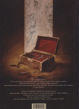 remarques: | édition originale, titre complet: le dernier temple d'Asclépios 1565, la Renaissance, l'art et la science sont en plein bouleversement et les guerres de religion couvent, mais une autre bataille, dans l'ombre, a déjà commencé, une bataille qu'on se livre autour du plus mystérieux des objets, de la plus merveilleuse des créations: le corps humain 1565 en Allemagne, un soi-disant sorcier, Conrad Gessner, est condamné au bûcher alors qu'une monstrueuse créature tente de le libérer 1565, à Paris, Ambroise Paré, un barbier-chirurgien-anatomiste s'emploie à perfectionner la chirurgie et est en butte aux physiciens, les médecins de la Faculté, qui enseignent la médecine traditionnelle selon la doctrine de l'antiquité, notamment celle de Galien >> p. 6 la greffe du nez sur le capitaine de la garde en outre, de mystérieux meurtres se déroulent à Paris alors que l'illustre medicus Fracastor reçoit une curieuse tapisserie >> p. 10 l'opération de la cataracte comme pratiquée par Ambroise Paré n.b. les opérations chirurgicales étaient alors de trois sortes: - synthèse (relier ce qui est cassé ou endommagé), - diérèse (réparer ce qui est unique), - exérèse (extraction ou ablation) et prothèse (remplacement) >> p. 13 la légende des Asclépiades, la médecine selon Asclépios, dieu grec de la médecine Sylvius, un ami de Paré meurt en dissimulant la clé de ses secrets, enfouie dans ses entrailles >> p. 15 le laboratoire de disséquation construit par Sylvius et la serrure originale pour y pénétrer à Rome, le pape, qui soutient les physiciens de la Faculté, charge le chasseur Jäger de retrouver les tapisseries contre ce péril, le principal des Asclépiades, le médecin-astrologue Michel de Nostredame, surnommé l'héritier, décide de s'allier avec les partisans d'Ambroise Paré >> p. 33 la théorie des Asclépiades sur la pathologie humorale qui explique le fonctionnement du corps humain une nouvelle alliance est aussi créé avec les primordiaux, les frères des premiers hommes, des animaux monstrueux dont parlent les légendes, genre dragon et licorne et dans les Alpes, Ambroise Paré et les Asclépiades s'efforcent de ressusciter d'anciens savants, tel Paracelse, ensevelis dans les glaces pour reconstituer les 5 humeurs contenues dans 5 tapisseries dont la cinquième, la plus importante, la Quintessence (ce en quoi se résument l'essentiel et le plus pur de qqch) >> un récit medico-fantastique sur fond historique concernant les sciences médicales le scénario est peu cohérent et difficile à cerner, le développement étant plutôt complexe, mais le graphisme est bien exécuté avec des décors somptueux heureusement, on reçoit quelques explications dans les pages de garde en fin d'album, notamment une petite biographie sur - Ambroise Paré (1509-1590) - Michel de Nostredame (1503-1566), un prophète-médecin, plus connu sous le nom de Nostradamus - André Vésale (1514-1564), fondateur de l'anatomie moderne ainsi qu'un exposé sur les opérations a) de greffe inventée par Tagliacozzi b) de la cataracte déjà connue dans l'Antiquité n.b. plus qu'Hippocrate, c'est au latin Galien que l'on doit les fondaments du savoir médical - à la Renaissance, la rivalité est grande entre médecins de la Faculté (partisans de Galien), entre les chirurgiens de robe longue (les anatomistes) et ceux de robe courte (les barbiers) ainsi que les apothicaires Information - AMBROISE PARE, né vers 1510 à Bourg-Hersent près de Laval et mort en 1590 à Paris, est un chirurgien et anatomiste français, Ambroise Paré, chirurgien du roi et des champs de bataille, est souvent considéré comme le père de la chirurgie moderne inventeur de nombreux instruments, il participe à l’amélioration et à la diffusion d’une technique de cautérisation d’un nouveau genre; l'utilisation généralisée des armes à feu confronte les chirurgiens à des plaies d'une sorte nouvelle que l’on cautérise au fer rouge ou à l’huile bouillante au risque de tuer le blessé Paré met au point la ligature des artères qu'il substitue à la cautérisation, dans les amputations "je le pansay, Dieu le guarist" on cite volontiers cette phrase modeste de Paré pour résumer sa philosophie (citation en moyen français signifiant: "je le pansai, Dieu le guérit") - dans la mythologie grecque, Asclépios ou Esculape en latin Aesculapius) est dans l'épopée homérique un héros thessalien puis, à l'époque classique, le dieu gréco-romain de la médecine fils d'Apollon, il meurt foudroyé par Zeus pour avoir ressuscité les morts, avant d'être placé dans le ciel sous la forme de la constellation du Serpentaire il correspond à l'Esculape romain, dont le nom est une traduction en alphabet latin du dieu grec, et à l'Imhotep égyptien, son attribut principal est le bâton d'Asclépios, autour duquel s'enroule un serpent, aujourd'hui symbole de la médecine. son principal lieu de culte est situé à Épidaure, où il guérit les pèlerins par incubation, il est invoqué dans le serment d'Hippocrate aux côtés de son père Apollon et de ses filles principales Hygie et Panacée il est l'ancêtre mythique des Asclépiades, une dynastie de médecins exerçant à Cos et Cnide dont Hippocrate est le plus illustre membre - dans la Grèce antique, Asclépiades est le nom donné à plusieurs familles vouées à l'exercice de la médecine elles prétendaient descendre du héros guérisseur Asclépios (Esculape), fils du dieu Apollon et de la mortelle Coronis, foudroyé par Zeus pour avoir voulu ramener un mort à la vie il y avait des Asclépiades à Épidaure, à Rhodes, à Cnide et à Cos, Hippocrate appartenait à l'une de ces familles il ne faut pas les confondre avec les prêtres-guérisseurs des temples d'Asclépios (bien qu'ils aient probablement une même origine commune) de nombreux sanctuaires étaient dédiés à ce dieu dans l'Antiquité gréco-romaine, ce sont les "Asclépie
