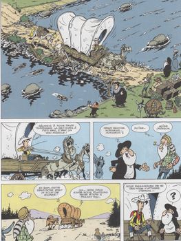 remarques: | prologue petit exposé sur Morris - né en 1923, il créé Lucky Luke chez Spirou en 1946, - 10 albums plus tard, il rencontre Goscinny qui deviendra le scénariste sur près de 40 albums, - ce sera l'âge d'or des aventures de Lucky Luke qui comptent en tout une centaine d'albums - et c'est en 2001 à l'âge de 79 ans que décède Morris lors de la production du 52ème épisode - à la mort de Goscinny à la 15ème aventure de la nouvelle série (le fil qui chante en 1977) de nombreux auteurs (Vicq, De Groot, Fauche, Vidal, Yann et d'autres) prendront le relai (avec en partie Morris comme dessinateur), mais ne pourront jamais plus égaler le grand Goscinny - dans le même genre, il y aura encore la série de Rantanplan, le chien le plus bête de l'ouest avec 20 albums de 1987 à 2011 ainsi que la série de Kid Lucky avec 4 albums 2 albums 1995 et 1997 dessinés par Morris et 2 albums 2011 et 2013 repris par Achdé mais de relativement peu d'intérêt surtout pour la série Rantanplan résumé Lucky Luke qui conduit un troupeau de longhorn rencontre Jack la poisse, le cow boy le plus malheureux à l'ouest du Pecos, Jack demande à Lucky d'accompagner ses parents juifs ashkénazes (= juifs d'Europe orientale d'origine germanique) venus de Pologne pour s'installer à Chelm City dans le Montana (ce serait leur terre promise) >> p. 8 le port de Saint-Louis, lieu de départ des caravanes vers l'ouest et l'arrivée de la famille juive polonaise >> p. 10 exposé sur les juifs en Amérique étant les principaux immigrants avec les esclaves d'Afrique, les irlandais, les allemands et les italiens >> p. 13 la bibliothèque de la famille Moishé Stern (le tailleur le plus rapide de Pologne) et les livres à transporter (le peuple du livre) et déjà les mauvais garçons (dont Ned et Goliath) reluquent les biens de la famille Stern le thème principal de ce récit sera l'épopée de cette famille à travers l'Ouest, épopée empreinte d'humour, de péripéties et surtout de culture, coutumes et cuisine juive plus ou moins douteuses dont les références juives tel à la guerre des six coups >> p. 20 Lucky Luke qui dort pieds-nus à la belle étoile >> p. 23 le passage de la Red River l'arrivée à Peachy Poy, la cité du plomb et des jeux >> p. 26+36 danse et musique yiddish >> p. 28 le cri de guerre yiddish pour faire avancer les chevaux: Davaï >> p. 31 un Lucky Luke qui délaisse cette fois lors d'une dispute son fameux revolver contre une winchester et après bien des mésaventures dans lesquelles rien ne manquent: peaux-rouges, outlaws, traversée de canyon et le 19ème de cavalerie, (n'y manquent que les frères Dalton) les pionniers juifs arriveront enfin à Chelm City >> p. 45 un banquet qui ressemble quelque peu à ceux d'Astérix >> pour les 70 ans de Lucky Luke, Dargaud, via sa filiale Lucky Comics, présente un nouvel album (no 48) sur Lucky Luke avec Jul comme scénariste et Achdé comme dessinateur après plusieurs épisodes peu dignes de Lucky Luke, ce nouvel album sur la terre promise ne remplit pas ses promesses, c'est un scénario de et pour des aventures juives avec Lucky Luke qui à part quelques gags acceptables n'est pas vraiment des plus intéressant le graphisme d'Achdé est toutefois respectable, mais le charme des dessins de Morris n'y est plus les auteurs rappellent aussi que les juifs ont contribué à la construction de l'Amérique, clin d'oeil à Einstein et à Madoff qui braque une banque information L'appellation Ashkénaze désigne "les juifs de l'Europe occidentale, centrale et orientale qui sont d'origine et de langue germaniques par opposition à ceux qui sont originaires d'Espagne et sont dits séfarades et aux Juifs descendant des communautés juives des régions proche et moyen-orientales dits Mizrahim, leur nom vient du patriarche biblique Ashkenaz les communautés ashkénazes se sont principalement concentrées en Allemagne, en Pologne, en Russie, dans l'ancien Empire austro-hongrois et, de façon plus clairsemée, dans le reste de l'Europe centrale et orientale les Ashkénazes sont caractérisés par des coutumes, un héritage culturel et des traditions religieuses particulières, la langue vernaculaire des Ashkénazes est le yiddish, variété de moyen-haut allemand enrichie d’emprunts à l’hébreu, au polonais et au russe, certaines sources attestent de leur présence dans toute l'Europe du nord-ouest au début du Moyen Âge les Ashkénazes constituent aujourd'hui la catégorie la plus nombreuse du judaïsme mondial |