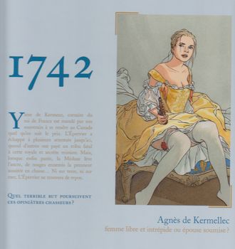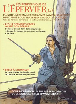 remarques: | après son escale à Port-Louis, la Méduse continue son lent voyage vers le Canada avec son équipage: capitaine Epervier et ses lieutenants Pisse-Roide, Main de Fer et Chaka ainsi que la princesse Mali, ses deux gardes-du-corps y compris son protecteur et traducteur, le père Martin n.b. la princesse est sensée rallier en Canada les tribus indiennes à la cause de la France ainsi que le kapitän Wagner de Karrer qui rejoint un régiment français à Louisburg, mais on ne connait pas très bien son rôle véritable et l'espion soi-disant guide baron de Villeon, un personnage qui fait semblant d'être un ivrogne avec un rôle qui n'est également pas très clair >> p. 6 la Méduse dans toute sa splendeur tandis que la Méduse est toujours poursuivie par deux frégates anglaises, à Paris le roi Louis XV et son ministre Maurepas s'inquiètent beaucoup sur la mission qu'ils ont confié à l'Epervier, alors qu'un mystérieux comploteur, avec ses complices l'italien Ricardo et la belle madame de Severac, sévissent à la cour du roi et en flash back on a droit: - au mariage forçé de la comtesse Agnès de Kermellec (amoureuse de l'Epervier) avec le brutal marquis de Beaucourt - réapparition de Tête de Fer et ses tueurs au Canada et >> p. 21 un triste épisode de la carrière de l'Epervier en tant que pirate la traversée de l'Atlantique est longue et perdure, heureusement une troisième frégate anglaise entre en action et cette fois l'Epervier doit livrer bataille pour forcer le passage >> p. 39/40 un combat naval tout à fait réaliste finalement la Méduse arrive à Louisburg où le kapitän Wagner est débarqué et où l'Epervier est mal accueilli, celui-ci réussira à se dégager, mais une partie de son équipage reste prisonniers le voyage vers Québec est à nouveau compromis tandis que la jolie Agnès se morfond, enfermée dans une cave par son pseudo-mari et que le mystère reste entier sur le but de la mission de l'Epervier au Canada persiste mais que faisait la princesse Mali en Afrique? espérons que l'on en saura un peu plus dans le prochain album annoncé - la princesse indienne (2020) >> ce ne sera pas le radeau de la Méduse et celle-ci arrivera à bon port au Canada, le graphisme de Pellerin reste superbe, (n.b. à comparer avec les albums Barbe Rouge dessinés par Pellerin), mais le scénario n'est le fort de Pellegrin qui fait vraiment traîner le récit >> voir l'excellent interview de Pellerin sur https//casemate.fr/pellerin-lepervier Information (les rendez-vous de l'Epervier) une série qui ne connaît pas au moins une actualité par an (nouveauté, intégrale, etc.) tend à disparaître de la mémoire des bédéphiles, le problème, pour un éditeur consciencieux, arrive quand son poulain, du fait de son perfectionnisme, préfère prendre son temps pour pallier cette situation, les éditions Soleil avaient pensé proposer aux amateurs impatients les rendez-vous de l’Épervier: une prépublication en trois numéros de l'album la Mission, chaque épisode comprenant également un dossier sur les différents aspects de l'approche de Patrice Pellerin, cette opération fut répétée pour le titre suivant: corsaire du Roy toujours en attente du prochain tome, les escales d'un Corsaire reprend aujourd'hui, réunis en un seul volume, les compléments parus initialement dans les six Rendez-vous découpé en quatre parties, l'ouvrage présente la somme d'efforts que nécessite l'élaboration d'une aventure de l’Épervier, bien que conteur romanesque avant tout, le dessinateur est aussi méticuleux et scrupuleux en ce qui concerne le cadre de ses récits, chaque détail doit être exact et chaque hauban à sa place, pour ce faire, outre une documentation impressionnante, le scénariste a su tisser autour de lui tout un réseau de spécialistes et de passionnés, ces personnes, auxquelles il rend un vibrant hommage au début du livre, et leur savoir sont au centre du succès de l'entreprise |