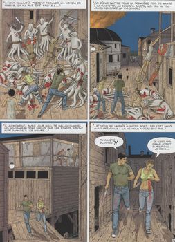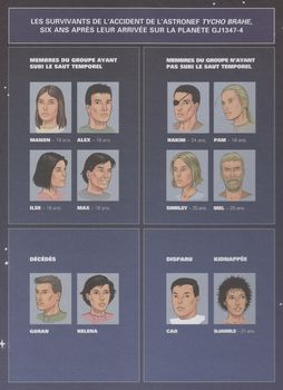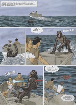 remarques: | durant leur expédition et après avoir pénétré la colonne de perturbation quantique, les 4 rescapés constatent qu'ils ont avancé de 93 ans dans le futur et l'île artificielle des hommes-pieuvres les a suivi dans leur avance, le quatuor décide alors de délivrer Djamile et pour cela, ils veulent provoquer un incendie sur l'île en y faisant écraser leur avion >> p. 6 des holorans (Antac et Selkert) très agressifs on retrouve Djamile ainsi que Cao qui se sacrifie pour le groupe, mais dans la lutte, Djamile et les holorans sont séparés d'Alex et Manon qui tous deux s'emparent d'un petit bateau >> p. 15 durant la bagarre, Manon est blessée et la réflexion d'Alex: "heureusement la lame n'a pas touché ton sein, j'aurais été inconsolable si ta superbe poitrine avait été blessée!!" tous se retrouvent comme Robinson sur une île déserte et inconnue, ils seront secouru un peu plus tard par un navire avec Max, Pam, Hakim et Ilse qui eux aussi ont subi le saut temporel le voyage se poursuit vers une autre île où on se livre à la cueillette de pommes des sables dans un conteste dangereux et en effet, nos amis sont agressés par deux navires pirates qui les font prisonniers seuls Alex et Manon (le tandem standard du récit) réussissent à s'échapper et ils trouvent à nouveau une embarcation et vogue la galère! >> p. 39 un visiteur agressif: un singe aquatique >> p. 41 et rencontre aussi avec une genre de mantrisse qui leur distribue des gélules (>> voir le cycle Bételgeuse et Aldébaran) finalement, les deux marins atteignent un continent inconnu en marchant, pour la dernière partie du trajet, sur une mer solidifiée mais de nouveaux dangers déjà les attendent >> rien de vraiment nouveau dans cet épisode, puisé en partie dans les cycles précédents sauf des aventures à la Robinson, mais à défaut d'histoire à l'eau de rose (comme dans le précédent épisode 3), il y a moins de l'action dans cet épisode 4 textes et graphisme acceptables n.b. il y aura encore un dernier album paru en 2017, mais non encore collectionné sur le site |