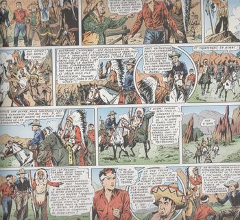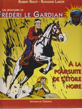 remarques: | récit paru dans Coeurs Vaillants 1949/1950 une épidémie mortelle frappe les taureaux du mas de Frédéri en Camargue, Frédéri apprend que des indiens d'Amérique détiennent un remède pour cette maladie, départ vers l'Amérique avec son ami Ulysse Galoubet >> p. 6 la messe d'adieu mais la piste de ce "trésor" attire aussi de mauvais garçons, toutefois après une séance de rodéo, nos amis partent à la recherche d'un vieil indien, surnommé l'étoile noire, qui serait détenteur du remède, on se débarrassera des bandits et on trouvera Black Star (étoile noire) qui fournira sa formule-remède d'herbes des montagnes du Colorado et finalement retour glorieuse au petit village provençal de Sauterigol qui sera suivi d'un pélérinage aux Saintes Maries de la Mer pour remercier la bonne vierge de sa protection >> p. 16 le mot de passe: les coyotes hurlent, mais les guerriers passent >> p. 21 un shériff à lunettes >> p. 24 les indiens doivent se soumettre au pays civilisé (les USA), "à vos ordres" répond le chef sioux Onondeyoh = montagne magnifique >> p. 35 monsieur le shériff >> p. 38 le grand canyon sous un ciel de Côte d'Azur >> p. 39 la devise de Frédéri: à Coeurs Vaillants, rien d'impossible >> p. 56 il est certaines circonstances où il est bon d'user de l'incontestable prestige de l'uniforme >> un texte vraiment un peu naïf et surtout très chrétien avé l'accent marseillais, peuchère! mais un graphisme acceptable qui ressemble quelque peu à celui de Le Rallic (ou vice-versa) Frederi fera son apparition dans Coeurs Vaillants en 1950 n.b. il y aura d'autres albums sur Frédéri tels que: a) aux éditions Fleurus - le signe de l'oiseau de feu (1954) - le mystère de Briamoz (1959) - le rancho de Manigoz (1959) b) aux éditions Triomphe - le seigneur de la jungle africaine (2000) - le secret de Badami (2006) mais seuls deux albums sont collectionnés ici à titre d'exemple représentatif des séries |