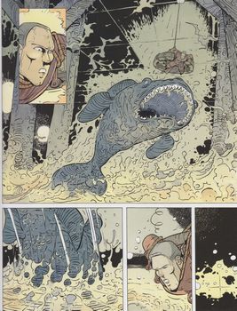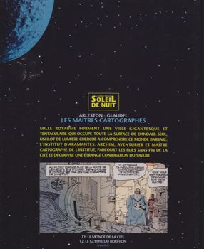 remarques: | aventures heroïc-fantasy sur fond polar >> p. 3 Dandale, cité et planète Archim devient maître cartographe d'Aramantès, il est chargé de continuer à explorer la contrée d'Hecyra où le cartographe Gnave a disparu Olivre, le voleur repenti, accompagnera Archim mais les cartographes ont des concurrents: les sapientistes >> p. 14 les moyens de payement: des cristaux pourpres >> p. 17 arrivée à Hecyra à l'hostellerie Rainault le Lane, l'affable tenancier où l'on apprend que le cartographe Gnave possédait le plan des derniers bois et parcs de la région, ce que le comité du gouvernement de Hycera aimerait bien aussi se procurer (car le bois est devenu une denrée rare), le comité réussira à mettre la main sur les plans et à capturer Archim, mais le comité ne peut pas déchiffrer les plans (= velins), rédigés par un cartographe n.b. le papier vélin est un papier sans grain, soyeux et lisse qui a la particularité de ne pas laisser apparaître de vergeures, ce papier évoque le vélin, un parchemin de luxe fabriqué avec la peau d'un veau mort-né vergeures = lignes parallèles très rapprochées >> p. 38 un bel éboueur d'égoût qui fait bien son travail après avoir retrouvé sa liberté et récupéré les plans, Archim retourne à Dandale avec Olivre >> un genre nouveau d'heroïc-fantasy frivole, façon Lanfeust de Troy, avec surtout de belles illustrations Information un monde recouvert d'une cité infinie, une planète où mille royaumes forment une ville gigantesque et tentaculaire: Dandale seul un îlot de lumière cherche à comprendre ce monde barbare: l'Institut d'Armantes Archim, aventurier et Maître Cartographe de l'Institut, parcourt les rues sans fin et découvre une terrible conjuration du Savoir, accompagné d'Olive le dérobeur, il va tenter de découvrir la vérité sur les étranges Sapientistes, placides, ces hommes qui tentent en sous-main de gouverner Dandale... une série forte originale où se mêlent humour et grande aventure |