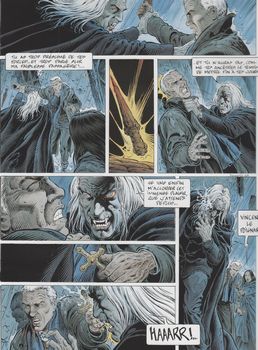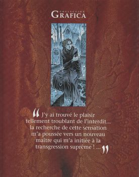 remarques: | à Paris, le vampire procède à sa régénérescence avec son complice qui doit lui fournir du sang, très frais, pris sur de jeunes enfants >> p. 6 le vampire et les chérubins Elise est devenue une morte-vivante et provoque la mort de son père alors que Vincent et le commissaire (Maigret/Gabin) sont toujours sur la piste du maître-vampire, le commissaire n'hésitant pas à collaborer avec la pègre parisienne pour retrouver la trace du tueur >> p. 19 l'entrevue du commissaire avec Eugène, le patron de la pègre et ce sera Elise, devenue une vraie vampire, qui les conduira au refuge de son maître, elle se sacrifiera pour que le prince de la nuit puisse s'échapper, mais elle connaîtra la sérénité ayant reçu un mortel coup de poignard en bois anti-vampire >> pas non plus de surprise pour cet avant-dernier volume de la série, si le graphisme est toujours encore respectable, le scénario se rrelâche malgré quelques scènes érotiques |