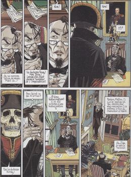 remarques: | 3ème volet: le terrible hiver 1870/1871, Paris est affamée sous le siège des prussiens >> p. 5 le commandant prussien victime de la malédiction de la diablesse >> p. 10 la réunion des bourgeois, je vous interdis de ne pas me permettre >> p. 17 l'entretien chez Me Rognard pour essayer de lui rogner de l'argent >> p. 20 l'histoire de la bague qui avait appartenu à une certaine Clémentine qui devint la maîtresse de Napoleon, mais en fait elle était devenue la complice du diable qui lui avait donné la fameuse bague pour exercer des pouvoirs maléfiques, depuis elle vivait avec des rats, mais Clémentine se suicida peu après et c'est sa fille qui hérita de la bague Nicolas et Anaïs sont fait prisonniers d'une bande de voleurs au service d'un certain comte, alors que Julien est livré à un asile de fous dont le directeur a été dévoré par ses pensionnaires >> p. 27 les conditions de l'armistice exigées par Bismarck pour mettre fin au siège Nicolas et Anaïs rencontrent un curieux personnage qui porte le même tatouage que Nicolas, la marque d'une association secrète qui veut combattre les nantis de l'empire, alors que la diablesse Adelaïde Favier (le no 27), fille de Clémentine, découvre son véritable visage de créature de satan >> album où l'on apprend quelque peu l'origine de la bague, mais un scénario devenant aussi bien complexe alors que le graphisme reste excellent à noter: le graphisme aux cases dessinées en hauteur avec détails des visages |