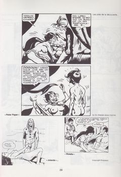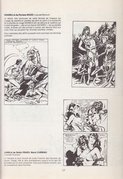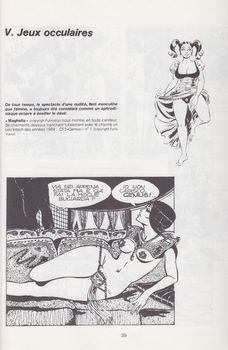 remarques: | cahier de 90 pages avec un aperçu de la bande dessinée érotique, principalement italienne, préface par Claude Soulard 1/ historique - début du genre avec les "eight pager" en Amérique et "Barbarella" en France en Italie les premiers "fumetti per adulti" se développent dès 1962 avec le premier du genre: le célèbre Diabolik, dessiné par Sergio Zaniboni et Paolo Ongaro, mais aussi avec Satanik, Kriminal, Fantax - les années 1969 à 1976 vont voir un véritable déferlement de titres de tout genre axés sur le sexe et la violence dont les plus connus: - fantastique Sangoor, Terror, Baby Satan, Demoni, Oltretomba, Lucifera, Vampirissimo, Jacula, Zora, Demona, Wallenstein, Satania, Sanguinari, Mezzanotte, Mefisto, Draculino, Satanik (une héroïne "noire"), etc - western Bonnie (par Zuffo), Raquel, la vergine nera, S amantha, Mortimer, Kalamity Jane - antiquité Theodora, Jessica, Angelica, Messalina, Lucrezia, Fra Diavolo, De Sade, Pompea, Leda, Angelica - moyen âge Isabella (première héroïne pour adultes), - science fiction Justine, Uranella, Zardon, Cosmine, Wampus, Selene (une imitation de Barbarella), Alika, - police, gangster Kriminal, Al Capone, Playcolt, Pussycat, Fantomas, Sadici, Violenti, - tropiques, jungle Jungla (la tarzane), Sandokaz, Karzan, Zan della jungla, - guerre Helga, Hessa, - pirates Jolanka, Loana, Jolanda, - divers (mysticisme, féerie) Makabar, Tenebrax, Emanuela, Gigetto, Peter Paper, Generentola, Sorchella, Pinocchio, Biancaneve, Maghella - des fascicules sur l'imitation de Diabolik et particulièrement violents seront publiés tel que Mister X (repris de Fantax par Chott), Fantasm, Sadik, Spettrus, Isterik, Vampir et Barbel Magic deux genres nouveaux vont connaître dès 1973 le succès: les "humoristico-sexy" et les fables ou contes de fée sexy - si parmi ces fascicules quelques dessinateurs sortent du lot tel le célèbre Magnus (Roberto Raviola), Buzzelli sous le pseudo de Blotz et Dino Zuffi (le dessinateur de petit sherif), la plupart des dessinateurs sont de moindre qualité graphique avec des scénarios peu recherchés - deux maisons d'édition se spécialiseront surtout dans ce genre de fumetti per adulti: les éditions RG (errighi de Renzo et Giuseppe) ainsi que Elvipress (Elvifrance pour l'importation en France) avec la revue "Zip" - sélection thématique de vignettes (pratiquement toutes en italien): 1) le baiser 2) les jeux de mains, les prises de forme 3) les jeux de bouche, le sein maternel 4) jeux occulaires (nudité, strip tease, voyeurisme) 5) jeux de filles, les nymphettes 6) jeux de garçons, homosexualité, pédophilie 7) le grand jeu (étreinte et accouplement) 8) jeux de groupe, les orgies 9) jeux bestiaires et extra-terrestres 10) jeu de brutes (viols, etc) 11) jeux divers (vampires, travestis, nécrophilie) et en dernière page une page de publicité pour le salon international de bande dessinée d'Angoulême (1978) >> un aperçu des parutions "fumetti per adulti" ou "fumetti neri", pas trop intéressant, graphisme étant peu recherché, et le manque de couleur se fait sentir (ces fascicules étaient publiés principalement en noir&blanc pour des raisons économiques) on peut dire véritablement que c'était une sous-classe de bande dessinée genre underground peu intellectuel et peu artistique et curieusement à part quelques titres, la censure n'a pas beaucoup sévi Information - fumetti est le nom donné en Italie à la bande dessinée, fumetti signifie "petites fumées", en référence à l'aspect des bulles servant à faire parler les personnages - en Italie, la BD se décline le plus souvent en fascicules de kiosques et non en albums cartonnés comme en France, - les personnages de fumetti les plus connus sont: Tex Willer, Diabolik, Blek le roc (Il Grande Blek), Alan Ford, Zagor, Capt'ain Swing (il Comandante Mark) et Pépito - on les retrouve tous publiés en France en petit format, en anglais, le terme "fumetti" désigne plus souvent les romans-photos italiens annexes - couverture de l'album - Uranella et Jungla - jeux occulaires - exemple de bande humoristico-sexy |
