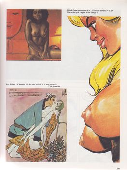 remarques: | une sélection, genre port-pourri, de la bande dessinée érotique dont entre autre des sujets thématiques avec illustrations >>> du même auteur voir aussi l'album "luxure de luxe" sans le puissant ressort de l'érotisme, la bande dessinée s'assoupirait, peut'être, dans les récits cocasses ou didactiques, cela veut dire que "les triomphes de la BD" n'on pu naître que grâce à l'érotisme de ses maîtres actuels présents dans cet album, mais il y a aussi un érotisme sous-jacent chez les grands d'antan, parfois escamoté par le fantastique et le non-sens, souvent dissimulé dans des détails, volontaires ou involontaires jamais une telle synthèse n'avait vu le jour, il est vrai que, depuis Botticelli, le vertige est fréquent thèmes les plus intéressants: >> p. 6 présentation de quelques héroïnes de BD "Betty Boop regarde ses soeurs" - la définition des comics, cartoons et fumetti - petite histoire de la bande dessinée, de Töppfer à la famille Avengers de Marvel >> p. 17 un dessin de Gustave Doré >> p. 36 les onomatopées dans la bd >> p. 41 les postures érotiques >> p. 53 Orion by Gray Morrow (1967) >> p. 76/77 décolleté et séances de bain >> p. 96 Lorna, the jungle girl (1953) - des femmes fatales bien connues: dragon lady, male call, Wash Tubs, Sally, pantera blonda, jungle girl, Jane, Blondie, Betty Boob, Maggie, wonder woman, Daisy Mae, Clarence Grey, Diana Palmer, etc >> p. 99 des seins pas comme les autres >> p. 105 les planches érotiques de Diana Palmer et ses cuisses bien découvertes >> p. 113 les héros de Marvel (Avengers et Cie) >> p. 118 Futura by John Douglas (1947) >> p. 169 contes à rebours >> p. 193 des seins bien sains >> p. 245 à 252 planches érotiques en couleur >> p. 246 Rowlf et sa belle by Richard Corben (1979) >> p. 253 Lone Sloane by Druillet >> p. 263 Fritz the cat (1968) >> p. 274 typologie évolutive >> p. 286 le mythe de Lilith >> p. 309 animalia >> p. 310 charme vénéneux by Bilal >> p. 340 croquis de Guy l'Eclair >>> une sélection thématique de vignettes bd érotiques, un pavé érotique de 358 pages, il y a du bon et du mauvais, mais il y a de tout (une documentation plutôt complète) annexes - 1er et 4ème plat de l'album - des vignettes et dessins (desseins) à gogo Information Joseph-Marie Lo Duca (Giuseppe Maria Lo Duca) est un écrivain et un critique de cinéma franco-italien né en 1910 et décédé en 2004, il est l'un des fondateurs des Cahiers du cinéma Lo Duca publie, à 16 ans, en 1927, son premier ouvrage de science-fiction: "la Sphère de platine" il s'installe à Paris en 1933, à partir de 1958, il dirige la collection "Bibliothèque internationale d'érotologie" publiée par Jean-Jacques Pauvert, en 1961, il aide Georges Bataille à terminer son dernier ouvrage "les larmes d’Éros" |