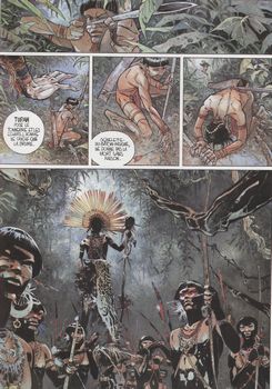 remarques: | février 1939, Eliane Goldschmidt, jeune linguiste française, débarque au Paraguay pour achever son étude de la langue guarani, chez les indiens Mbyas, elle découvre un peuple apathique, résigné, comme s'il avait décidé de se laisser mourir, mais le village est en effervescence, on attend la venue prochaine du Karaï, l'homme-dieu, qui les conduirait à la terre sans mal, ce mythique paradis de la légende indienne la terre sans mal est le récit fabuleux d'un voyage magique et tragique à la fois en séjour chez les indiens Mbyas du Paraguay, Napagnouma, la femme blanche qui fait pleurer son bâton et un beau jour, après la venue d'un karaï (genre de messie), la tribu entreprend un voyage vers la terre sans mal n.b. le monde étant devenu mauvais, les indios veulent rejoindre la terre sans mal >> p. 30 découverte de la ville abandonnée en pleine jungle et la guerre ayant éclaté en Europe, la femme blanche qui est juive et dont les parents sont morts en déportation, décide de rester parmi ses amis indios >>> un scénario ni trop bien ni trop mal, mais pas fascinant avec un graphisme assez bien élaboré, seul et unique album publié dans cette série il y a plusieurs auteurs Lepage, celui-ci est plutôt prolifique et son prénom est Emmanuel à ne pas confondre avec Pierre Lepage qui a publié un album sur la bataille des Ardennes (>> voir le titre Nuts dans histoire de l'histoire) |