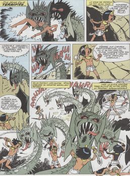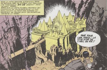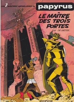 remarques: | le Nil se tarit malgré la présence du pharaon, dieu vivant, fils d'Horus, vie, force et santé Papyrus part à nouveau en mission et découvre que la source du Nil est aspirée par la terre, il se lance alors à la poursuite d'un mystérieux oryx qui, attaqué par un dragon et sauvé par Papyrus, devient une jeune fille qui confie à Papyrus le secret de l'oeil de Ré et lui donne un talisman protecteur Papyrus devient le maître des trois portes et découvre le cours souterrain du Nil mais entretemps Théti Chéri a été transformée en statue d'or qui s'anime pour détruire son père le pharaon mais Papyrus réussira à l'en empêcher grâce à son talisman, toutefois pharaon est maintenant possédé par un dieu-démon et ordonne que Papyrus soit jeté dans la fosse des régicides où Papyrus trouvera toutefois un passage secret conduisant à la cité d'or de l'oeil de Ré où il retrouve Théti Chéri bien vivante >> p. 35 la cité d'or de l'oeil de Ré par l'escalier interdit, Papyrus pénètre dans l'oeil de Ré, maître de l'univers et se trouve façe à un nouveau pharaon: Menès Horus, fondateur de la première dynastie qui veut créer une nouvelle Egypte mais Papyrus réussira grâce au talisman à retourner les forces du soleil contre Menès Horus ce qui sauve le vrai pharaon et sa fille Théti Chéri >> p. 40 façe à Ré-Harakhty le Nil ne sera plus tari et coule à nouveau normalement >> un album de space-opéra fantastique dans l'Egypte ancienne, toujours un récit bien imaginé et un graphisme respectable |