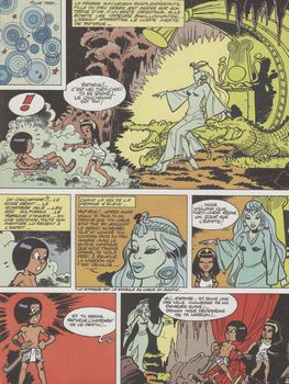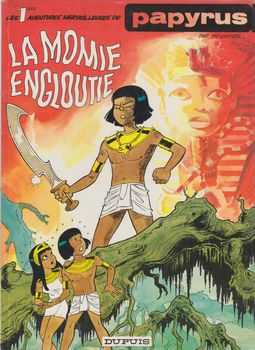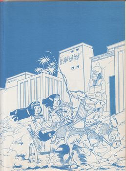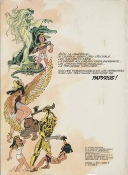 remarques: | album original à titre d'exemplaire représentatif, par rapport aux rééditions, l'impression et le coloriage sont bien meilleurs Papyrus, le petit pêcheur égyptien, est appelé par la fill de Sebek, le dieu-crocodile, à rechercher la momie perdue de la princesse Néfernéferou Théti-Chéri il arrive dans une forêt carnivore où il est fait prisonnnier par des pygmés velus, mais sauvé par Tamik, le fils du chef >> p. 11 l'astuce de Papyrus pour se disculper il est malgré tout jeté dans le temple immergé où il découvre le sarcophage contenant, bien vivante, Théti Chéri tous les deux réussissent à s'échapper du tombeau, mais échouent dans un monde de terreur où Papyrus doit triompher de nombreuses épreuves avant de paraître à nouveau devant la déesse Sebek >> p. 30 Papyrus a vaincu sa peur et reçoit un glaive magique Papyrus pourra alors rendre Théti Chéri à son père le pharaon >> p. 38 le boomerang répandu alors en Egypte (en plus de l'Australie) >> p. 41 les égyptiens ne montaient pas les chevaux, mais les attelaient à des chars >> un récit à l'eau de Papyrus, simple mais plutôt efficace avec une bonne documentation sur l'Egypte et un graphisme bien élaboré à noter une coutume bien égyptienne: le fard autour des yeux de Papyrus |