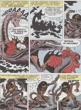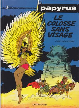 remarques: | Papyrus et Théti Chéri en chasse après un rhinocéros blanc découvrent une étrange statue (sphinx à tête d'hyène) qui hurle dans la nuit par la suite, Papyrus rencontre un étrange vieil homme qui lui confie la mission de libérer son peuple dans la cité de Basalte Papyrus y trouve l'entrée, doit confronter des statues de hyène mais il a enfreint l'interdiction du dieu-crocodile Sebek qui le transforme en loup-garou >> p. 17 le colosse sans image qui retrouvera son image grâce à Papyrus pourchassé par les hommes, Papyrus se réfugie auprès de Théti Chéri qui demande l'aide du grand prêtre Raouser pour conjurer la malédiction celui-ci veut bien l'aider mais Théti Chéri doit se rendre sur l'île sacrée des dieux et elle devra payer le prix de sa requête sur le chemin de l'île, tous deux devront encore dompter le dragon-passeur et Théti Chéri cherchera à charmer le grand dieu Ré par une danse émotive mais Ré ne peut pas changer le sort de Papyrus alors Théti Chéri demande que tous les éyptiens soient changés en loup-garou contre sa propre vie en échange et impressionné par la générosité de Théti, le grand dieu cèdera aux demandes de Théti Chéri et le dieu-crocodile doit redonner à Papyrus sa forme humaine mais Théti Chéri y perd ses dons de danseuse sacrée >> p. 44 la danse sacrée de Théti Chéri pour amadouer le grand dieu >> une aventure charmante dans la lignée des récits de la série, avec un graphisme qui reste acceptable |
