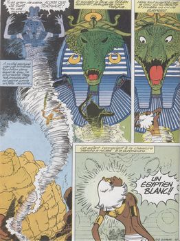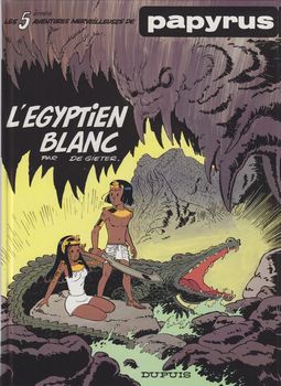 remarques: | en chasse sur le Nil, Papyrus et Théti Chéri découvrent un chtiquechtaquelaguelac (lutin magicien) épuisé, ils décident alors de le raccompagner à la forêt morte lors du voyage, ils sont surpris par des pilleurs de tombes déguisés en momie vivante, Papyrus utilise alors les pouvoirs du manteau magique du lutin qui se révèle être un essaim de guêpes furieuses et qui, après avoir écarté les pilleurs, transporte Papyrus vers la déesse aux cheveux d'or (la fille du dieu Sébek) >> p. 15/16 la méthode pour se concilier les chtiquechtaquelaguelac l'histoire de la forêt morte et de la montagne dévoreuse, lutte contre le cobra durant laquelle les cheveux de Papyrus deviennent blancs (d'où l'égyptien blanc) >> p. 28/29/30 l'aventure avec le cobra, de belles planches et pour délivrer la déesse, Papyrus, grâce à ses cheveux blancs, réussit à surprendre le dieu-crocodile Sébek qui avait puni sa déesse de fille pour avoir désobéi à ses ordres, Sérek, surpris, est neutralisé et tout redevient normal >> un récit genre conte de fée mais au scénario bien conçu et avec un graphisme amélioré |