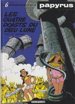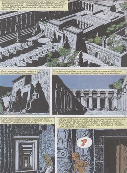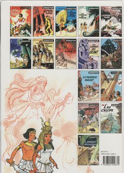 remarques: | Thèbes à l'heure où Thot, le dieu lune, règne en maître, le jeune prêtre novice Hapou effectue une ronde nocturne et disparaît alors que Théti Chéri devient la prisonnnière d'Anubis, dieu de la mort en l'absence de pharaon, son frère Ahmès gouverne en despote et Papyrus subit des tentatives d'assassinat il décide alors de retourner en son village natal, mais indigné par l'oppression du peuple, il s'allie avec l'handicapé Imhoutep, avec le voleur Pharo et ses frères-voleurs de Thèbes pour fomenter une révolte jusqu'à l'arrivée du vrai pharaon >> p. 19 fuite à travers le nilomètre abandonné n.b. nilomètre = puits communiquant avec le NIl qui permettait aux égyptiens de contrôler le niveau de la crue s'en suit une série de péripéties dont à nouveau la danse exotique de Théti Chéri pour appeler les "fausses" créatures d'or >>> voir l'album le maître des 3 portes afin de renverser le despote Ahmès, lutte également contre Thot, dieu de la nuit qui, battu, s'envole métamorphosé en un ibis d'argent et rétablissement du vrai pharaon Méreuré >> p. 38 à nouveau une danse royale de Théti Chéri avec un cobra >> p. 46 l'unijambiste Imhotep et le mendiant à 4 doigts du dieu Thot >> histoire et graphisme dans la moyenne avec toujours un dessin fidèle et détaillé de l'architecture égyptien n.b. dernier album collectionné mais la série se poursuit avec 26 autres albums du no 7 (1984) la vengeance des Ramsès au no 33 (2015) Papyrus pharaon album qui clôt la série |