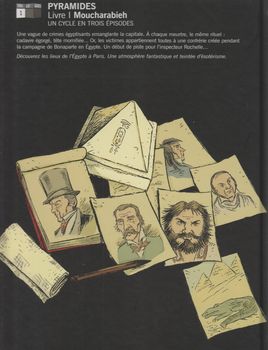 remarques: | enquête policière sur fond d'égyptologie 1820, une vague de crime sans précédent submerge Paris, plus sordides les uns que les autres, les meurtres obéissent tous au même rituel: cadavre égorgé, tête momifiée… lors de ses recherches, l’inspecteur Rochelle découvre que les victimes appartiennent à une bien mystérieuse communauté créée pendant la campagne de Bonaparte en Egypte Rochelle découvre que le seul survivant de cette confrérie de la Sphinge, l’architecte Jamort, est soupçonné d’être le meurtrier qui embaume les viscères de ses victimes avec cette série, Didier Quella-Guyot a choisi de situer son enquête policière dans une époque peu utilisée par le genre, il a décidé de mettre en avant des éléments peu connus de la vie de Bonaparte et de sa campagne d'Egypte Rochelle, inspecteur de police mais dessinateur à ses loisirs avec son assistant Victor Vidocq enquêtent les explications du savant Vivant Denon sur l'expédition de Bonaparte en Egypte 20 ans après, la victime faisait partie de la confrérie du sphinge = groupe de cinq hommes qui se doivent mutuellement la vie lors de l'expédition égyptienne >> p. 18 le quartier du Caire à Paris >> p. 31 le moucharabieh = magazin d'objets égyptiens et érotiques mais c'est aussi le nom des volets de bois finement ouvragés qui permettent aux femmes arabes de regarder sans être vues >> p. 37 des toboggans aux fêtes foraines déjà en 1820 le meurtre se produit avec chaque fois une cartouche hiéroglyphe près du cadavre et l'assassin collectionne les abats de ses victimes (intestins, poumons, estomac) les soupçons de Rochelle se portent sur Jabort, le dernier survivant de la confrérie et son secret à découvrir dans le prochain album >> le graphisme n'est pas exceptionnel sauf les couvertures d'album bien effectuées mais l'intrigue est assez originale |