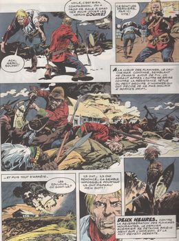 remarques: | dans la collection un homme, une aventure première édition, tome 3 l'épopée de la guerre entre anglais et zoulous avec la résistance de Rorke'drift le 22.1.1879 où une centaine de soldats anglais résistèrent à une horde de 4000 guerriers zoulous, sans oublier les nombreux accrochages entre Boers et Zoulous battus à la bataille de Blood River les trois régions: - le Transvaal occupé par les Boers, - le Natal = colonie anglaise du Cap - le Zoulouland au nord séparé des autres régions par les rivières Buffalo et Tugela l'avantage des guerriers zoulou sont leur mobilité et leur arme favorite, la sagaie, courte à longue pointe, maniée comme un glaive au Zoulouland, le roi Cetshwayo s'apprête à combattre les troupes de lord Chelmsford qui ont franchi la frontière, les mésaventures du marchand allemand Reich >> p. 16/17 les zoulous sont les champions à la course à pied et peuvent même un certain temps rivaliser avec un cheval au galop à Isandhlwana, un régiment anglais est anéanti, les survivants se réfugient à Rorke's drift où une centaine d'hommes se sont fortifiés ushuta = le cri de guerre des zoulous de 17.00 heures à 2.00 heures du matin, la petite garnison tiendra tête aux assauts continus des zoulous, finalement ceux-ci se retireront en rendant hommage au courage de leurs ennemis et après l'effort, une tasse de thé réconfortante >> un très bon récit avec un graphisme également bien réussi >>> voir aussi à ce sujet, l'excellente série Zoulouland by Ramaoïli |