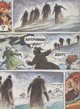 remarques: | dans la collection un homme, une aventure première édition Dargaud, tome 7 a) petit exposé sur l'homme des neiges le 22.9.1921 première découverte des traces d'un éventuel homme des neiges (surnommé par les indigènes: Metch-Kang-Mi) au col du Lhakpala à 6812 m d'altitude par l'expédition anglaise Howard-Bury de là naquit la légende de l'abominable homme des neiges par la suite, il y eut de nombreuses affirmations qui ne furent toutefois jamais authentifiées les tibétains parlaient de Mi Go et les sherpas les appelaient Yeti, nom qui sera finalement utilisé pour désigner un possible homme des neiges b) récit basé sur les impressions du grand explorateur Waddel, un journaliste anglais décide d'aller lui-même sur les lieux pour enquêter son expédition se retrouve effectivement devant des êtres de montagne mais les visions semblent être irréelles le récit finira par un panégyrique du bouddhisme avec mention du mahâtma (souverain universel) et de l'agartha (royaume souterrain légendaire, genre de paradis de l'esprit) et le journaliste deviendra bouddhiste >> un récit quelque peu mystique malgré l'abominable homme des neiges et un graphisme propre à Manara à ses débuts |