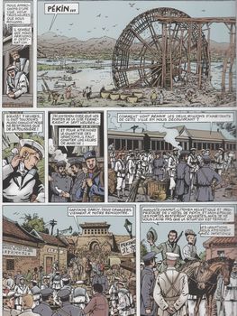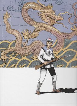 remarques: | Tombelaine: rocher sauvage battu par les embruns, sur lequel se cramponne un manoir délabré, c'est là, dans le vieux domaine familial, que s'écoule la jeunesse de Quentin Fortune c’est le temps des jeux innocents avec Amélie, des premiers émois et des premiers serments, pourquoi faut-il qu'à son retour du service militaire, Quentin apprenne que son père a vendu son cher Tombelaine à Lebeuf, l'énigmatique père d'Amélie? pendant ce temps, à l'autre bout du monde, une révolte couve, les Boxers veulent chasser les Occidentaux de Chine où ils exploitent de larges concessions, les premiers massacres frappent les missions chrétiennes en Extrême Orient, l'Europe décide d'envoyer des troupes à Pékin pour défendre ses légations Quentin Fortune, un breton, originaire de Tombelaine, est amoureux d'Amélie, fille du lourdaud Lebeuf en Chine en 1900, c'est le début de l'agitation des "Boxers" >> p. 8 Tseu-Hi, la vieille impératrice douairière qui achève son traditionel potage de nids d'hirondelles mais avant de partir, Quentin a quelques difficultées avec Lebeuf, père d'Amélie, qui lui n'aime pas du tout Quentin >> p. 20/21 la course entre un attelage et une automobile Quentin découvre chez Lebeuf un trafic d'antiquités chinoises contenant de l'opium, il veut le dénoncer mais Lebeuf lui tend un piège et oblige Quentin à s'engager dans un corps expéditionnaire qui part pour la Chine débarquement à Tien Tsin et premiers coups de feu pour Quentin >> p. 34 les missionnaires qui sont satisfaits par l'opération nettoyage des marsouins à Tien Tsin 300 hommes de 6 nations se rassemblent pour protéger les légations internationale de Pékin >> p. 37 les britanniques font bande à part en sirotant un thé fadasse et tiède une bande dessinée classique, Capo étant l'élève de Chaillet qui a été lui-même l'élève de Martin et l'influence de Chaillet/Martin est évidente sur le graphisme de Capo, le récit malgré le fond historique n'est pas très recherché et rien de particulier se distingue dans le graphisme dans ce premier épisode, Capo signe un dessin encore non mature, il est malheureusement trahi par de bien piètres couleurs. |