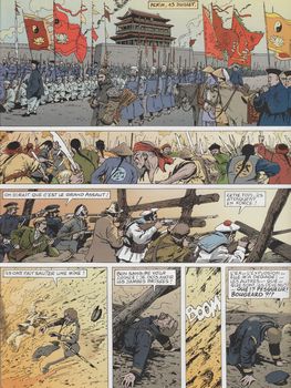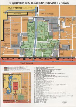 remarques: | lors de leur mission pour rejoindre Tien Tsin, Quentin et Mai sont rejoints par LeGall qui a déserté >> p. 17 Quentin est un très très bon tireur le contingent de l'escadre de Symour est retrouvé mais doit battre en retraite suite à de nombreuses escarmouches avec les Boxers et l'armée chinoise à Pékin, les Boxers mettent le feu à la légation de France, les caves sont touchées et les marsouins sont engagés pour mettre les bonnes bouteilles en lieu sûr!! finalement, l'arrivée de 2000 russes repousse pour un temps les assauts des Boxers sur le chemin du retour, Quentin est trahie par Mai qui semble-t-il était membres de la société des Boxers, Quentin est capturé mais Mai lui garde toute son amitié et son amour? 1.7.1900 les légations résistent toujours le 13.7. toujours pas de renfort en vue la situation des légations est maintenant désespérée >>> continuation de la série avec de la sueur et du sang, mais contrairement à la couverture, Quentin ne subira pas le fouet ni la cangue scénario et graphisme encore acceptables en annexe, description bien détaillée du quartier des légations (zone verte claire) durant le siège du 20.6. au 15.8.1900, les deux plus grandes zones étaient la légation d'Angleterre et le palais du prince Fou où s'étaient réfugiés 3000 chrétiens chinois et en vert foncé les zones de résistance au 14.8.1900 |