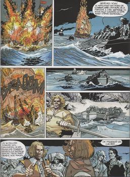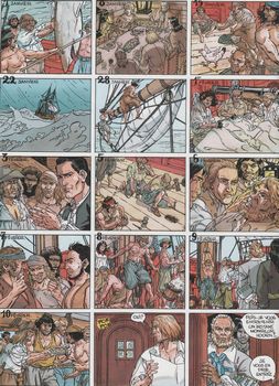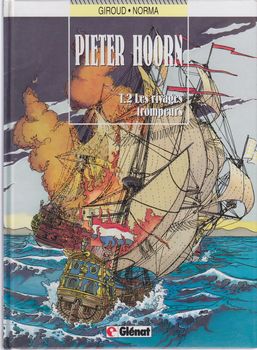 remarques: | le Korenbloem qui a repris son vrai nom est en route pour Kaapstad avec Hoorn le cartographe et son amie Julia (qui est en fait une espionne anglaise) >> p. 3 les poissons volants = des exocets (comme le missile) mais un espion français s'est introduit dans l'équipage concernant l'opération Golgotha (on n'en saura encore pas plus) >> p. 17 l'espionne Julia au travail 45 jours plus tard, sans avoir aperçu de terre, la mutinerie gronde sur le Korenbloem >> p. 21 la punition du meneur des mutins après avoir maîtrisé la rebellion, la vaisseau arrive en vue des îles Tahiti à la grande surprise du cartographe Hoorn qui constate que les côtes de la Nouvelle Hollande (Australie) ont été grandement dépassées grande réception par les tahitiens >> p. 35 l'importance du cocotier chez les tahitiens après cette interlude, le Korenbloem remet le cap sur la Nlle Hollande dont les côtes sont atteintes 20 jours plus tard mais deux frégates françaises attendent les hollandais le combat est inégal et le Korenbloem en flamme, Hoorn et ses amis réussissent à gagner terre en chaloupe, l'expédition continue par voie terrestre >> un récit qui ressemble diablement à l'épopée du Bounty, le graphisme reste respectable avec une jolie couverture d'album à noter que le cartographe Pieter Hoorn est une figure légendaire et n'a pas du tout existé information la Compagnie néerlandaise des Indes orientales (connue en néerlandais sous le nom de Vereenigde Oostindische Compagnie, dans sa graphie moderne Vereenigde Oost-Indische Compagnie, ou VOC, littéralement « Compagnie unie des Indes Orientales ») est une compagnie de commerce créée par les Provinces-Unies en 1602, elle est pendant près de deux siècles l’un des piliers de la puissance du capitalisme et de l’impérialisme néerlandais, dissoute en 1799, la compagnie est connue pour avoir été l’une des entreprises capitalistes les plus puissantes qui ait jamais existé, contribuant fortement à l'Histoire des bourses de valeurs, créée alors que le capitalisme n'était encore qu'en gestation dans un monde féodal, elle a inspiré plusieurs grandes caractéristiques des entreprises modernes: le modèle de la société anonyme émettant des actions et obligations ainsi que le modèle de la multinationale implantée dans des pays à l’autre bout du monde elle est la plus influente des compagnies européennes fondées au XVIIe siècle pour exploiter les richesses d’Asie. sur le plan politique, les conquêtes de la compagnie permettent aux Provinces-Unies puis aux Pays-Bas de disposer d’un empire colonial significatif en Asie jusque dans la seconde moitié du XXe siècle (notamment Sumatra, Java, îles Moluques avec capitale Batavia) en annexe sigle de la Vereenigde Oost-Indische Compagnie |