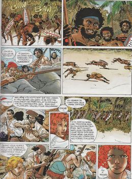 remarques: | et un peu plus tard, Hoorn et ses compagnons tombent sur l'épave du Jupiter, échoué dans la passe des Cyclopes mais les deux espions font toujours encore partie du groupe >> p. 10 l'attaque des papous (n.b. en fait habitants de la Nlle-Guinée et non de la Nlle-Hollande) par la suite, la troupe arrive dans une baie, appelée baie des français, car ceux-ci y ont établi un fortin avec port de mouillage pour les grands vaisseaux on y retrouve prisonniers, les hommes du Jupiter qui sont délivrés par une opération fracassante menée par Hoorn qui constate la traîtrise de l'espion français Charles Lhomond, abattu durant l'attaque du fortin français et l'opération Golgotha est dévoilé, il s'agissait d'une offensive sur Batavia par la flotte française >> p. 23 l'histoire du matelot Storm, ex-matelot du Jupiter, qui a réussi à s'évader et à rejoindre Hoorn à Amsterdam, >> voir le tome 1 (un vrai roman qui pourrait faire l'objet d'un album supplémentaire) les hollandais s'emparent d'un vaisseau français et partent en direction de Batavia en utilisant pour la première fois le détroit de Torrès (entre l'Australie et la Nlle-Guinée) mais maintenant c'est Julia qui passe à l'action en voulant s'emparer des cartes et du vaisseau, malheureusement Julia perdra la vie dans cette tentative et Pieter Hoorn regagnera Amsterdam sans gloire et sans richesse >> un troisième tome qui finit misérablement la série tant pour le récit que pour le graphisme bien délaissé, troisième album qui se retrouve aussi pauvre que Hoorn après son expédition |