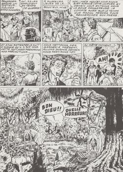 remarques: | les aventures de l'explorateur Mike Cougar dans la jungle brésilienne découverte de l'homme mort brûlé mystérieusement dans le Matto Grosso, une expédition est organisée vers la monts Toukou mais une colonne d'aventuriers peu scrupuleux se met aussi en marche croyant découvrir des minérais inconnus celle-ci devancera la colonne de Mike Cougar et tombe dans le piège tendu par les indios Magalos >> p. 28/29 combat avec les jivaros: mitraillettes contre sarbacanes mais une apparition inopinée d'extra-terrestres avec soucoupes volantes éloignera les indios, rencontre de Mike Cougar avec les aventuriers qui seront mis hors d'état de nuire Mike Cougar et ses compagnons songent à prendre le chemin du retour, mais d'autres aventures les attendent dans le tome 2 intitulé les fugitifs >>> un récit sans grande distinction et le graphisme n'est pas encore bien recherché mais s'améliorera par la suite n.b. Pierre Kosc, un dessinateur-auteur peu connu mais un ancien de l'écurie "Heroic Albums" où il signa quelques oeuvres sous le pseudonyme de Leika puis travaille pour les éditions Deligne avec les aventures de Mike Cougar, une série de 2 volumes qui ne verra pas de suite; autres oeuvres: inspecteur Caryton et commissaire Maroff |
