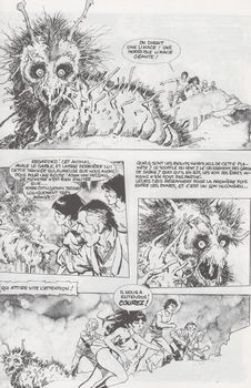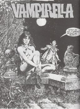 remarques: | premier opus, tome 1 au delà du temps et de l'espace aux éditions Soleil Vampirella est originaire de la planète Drakulon, un monde où les gens se nourrissent de sang et où il coule dans les rivières, Drakulon possède deux soleils, Satyr et Circe, ce qui provoqua une première éruption qui détruisit toute vie sur la planète, quand les effets de l'explosion se réduisirent, une nouvelle civilisation apparut: la race de laquelle Vampirella naîtra, les Vampiris, qui étaient capables de se transformer en chauve souris à volonté, quand il le fallait, pour boire du sang l'histoire commence lorsque la planète Drakulon se meurt lentement à cause de l'éruption de Satyr, alors qu'une navette spatiale venue de la Terre s'écrase sur Drakulon, Vampirella découvre que les astronautes ont du sang dans leurs veines sur l'ordre de ses semblables, elle ramène la navette sur Terre et part à la découverte de notre planète venue tout droit de la planète Drakulon, Vampirella débarque sur Terre et fait connaissance avec la famille Van Helsing la famille Van Helsing lutte depuis des années contre Dracula et le mystérieux culte de Chaos, auquel appartient le comte, lequel vient également de la lointaine planète Drakulon Vampirella tombe amoureuse du jeune héritier des Van Helsing et se joint à sa famille dans leur lutte contre le comte Dracula n.b. une vampire contre un vampire! une histoire de vampires mettant en scène Dracurella, le comte Dracula, la déesse Evocatrice, la famille Van Helsing et de nombreux humains livrés au caprice des démons du sang plusieurs épisodes composent cet album dont - prenez garde, rêveurs - Dracula est en vie - l'ombre de Dracula - la mort en marche - le monstre des sables - l'enfer blanc - Bayou sanglant (bayou = étendue d'eau) >>> une Vampirella pas des plus attrayante et surtout très bavarde, (à comparer avec la Dracurella de Ribero) et au graphisme sanglant en noir&blanc! la série comporte 3 autres albums: - tome 0 Vampirella aux éditions Triton (en couleur 1980) - tome 2 Vampirella 2, aux éditions Soleil (1996) - tome 3 la guerre de Dracula (Harris comics 1998) et plusieurs ouvrages sont parus sur le personnage de Vampirella dont en autres: - Vampirella de Warren Publishing (1973) - Vampirella, city of love Harris comics (1993) - Vampirella 24 numéros chez Publicness (1971-1976) - Vampirella (sous le nom de Jacula), la reine des vampires chez Elvifrance, une centaine de nos porno-erotico (1970-1980) n.b. à part dracurella aucun autre album n'est collectionné ici en annexe - couverture de l'album - la Vampirella de Frazetta - Vampirella dynamita - 4ème plat et extraits de l'album - couverture du 2ème tome Soleil information premier recueil de la série Vampirella paru chez Soleil, ce tome commence directement dans la vif de l’action, mettant de côté l’arrivée de Vampirella sur terre et sa rencontre avec la famille Helsing (même si les deux derniers chapitres de cet opus permettent aux lecteurs de se faire une idée sur le sujet) l’ensemble se laisse lire mais le pendant SF-Fantastique donné ici au mythe du vampire accuse quelque peu son âge, les influences lorgnant allègrement vers des séries comme Dr Strange ou Tomb of Dracula; les scénarios sont pour le moins répétitif, les thèmes abordés étant les même d’un bout à l’autre de l’album, mais l’ensemble à tout de même un côté attirant qui en rend la lecture fluide. le dessin en encrage joue beaucoup dans l’attractivité de l’album |