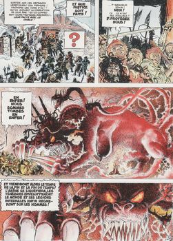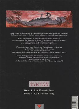 remarques: | bande dessinée parue dans Charlie en 1987 alors que la Renaissance rayonne dans les capitales de l'Europe, l'obscurantisme et la barbarie règent dans les campagnes le moine boudhiste Takuan et ses compagnons, le Vénisien Adso et la jeune Rébecca, parcourent l'Europe du XVème siècle, leur parcours sera jalonné de rencontres aux lisières du surnaturel une horde de fanatiques religieux massacrent tout sur leur passage et mettent le pays à feu et à sang, ils sont appelés les fous de Dieu 1493, à Venise, les mercenaires l'allemand Conrad Turlow et le vénitien Adso, ont pour mission d'escorter le moine bouddhiste Takuan jusqu'à la cour de France >> p. 13 dans une auberge de passage, l'arme secrète de Giuletta >> p. 22 Rebecca, la petite sorcière, cracheuse de feu, un mystère de la nature, qui se joindra au trio sur leur route, le groupe rencontre par hasard une meute de gueux (les fous de dieu) et Conrad décède dans la bagarre >> p. 36 les pouvoirs efficaces de la petite sorcière et ceux tout aussi efficaces de Tekuan avec son bâton après s'être débarrassés des gueux, Adso, Takuan et Rebecca arrivent enfin dans le royaume de France où ils doivent remettre un secret au roi de France >> le scénario n'a pas grand chose dans le ventre, mais le graphisme est assez particulier |
