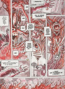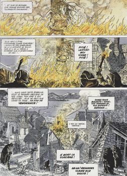 remarques: | aux portes du royaume de France, Takuan, Adso et Rebecca se trouvent opposés au seigneur de Sillé, un fou sanguinaire dont les rites sataniques mettent en péril la vie de Rebecca, adorateur de Belzébuth, Sillé recherche le secret de l'immortalité en sacrifiant de jeunes enfants selon les préceptes du "livre de sang" >> p. 8 les 5 règles fondamentales de l'art du bâton par Takuan: vigilance, endurance, promptitude, souplesse et patience le serviteur du seigneur de Sillé recherche des enfants-sorciers auprès de la sorcière Meffraye n.b. Sillé était l'élève de Gilles de Rais >> p. 18 le feu qui obéit à Rebecca rencontre entre Meffraye et Rebecca, à leur façon deux mêmes sorcières >>p. 42/43 et Rebecca envoya le sinistre sire de Sillé dans les flammes de l'enfer >> un scénario sans grande profondeur mais amplement compensé par un graphisme bien étudié de Simeoni |