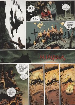 remarques: | sur la route de Compostelle, Takuan et ses compagnons se joignent à un groupe de pélerins, il y a là des estropiés, des scrofuleux, des difformes en tout genres... et une très belle femme, dame Esclarmonde, qui a entrepris ce voyage dans le but de guérir mais le mal qui la ronge est bien différent: il lui garantit une éternelle jeunesse au prix d'une inextinguible soif de sang Takuan l'aidera à rompre la malédiction dont elle est victime, mais Takuan ignore cependant la ténébreuse puissance de ceux qui s'abreuvent à la source noire au trio s'ajoute un nouveau compagnon, maître Randolphe rencontre avec les pélerins sur la route de Compostelle dont dame Esclarmonde fait partie on découvre alors que dame Esclarmonde et en fait une sorcière-vampire (elle ne sort que la nuit de son chariot) les pélerins veulent alors l'éliminer mais elle est défendue par Tekuan qui, avec Rebecca, veut l'amener en pays cathare pour conjurer le sort >> p. 27 la lutte de Rebecca avec la sorcière arrivé à destination, le trio est confronté par Siccard, le maître-vampire, celui-ci sera éliminé, le sort jeté sur dame Esclarmonde, semble avoir été écarté, mais Tekuan sera malgré tout sucé de son sang (par dame Esclarmonde?) la fin du récit n'est pas claire, elle sera peut'être expliqué dans le prochain album: "la mère des douleurs" (1996), mais non collectionné ici >>> le graphisme est acceptable mais le récit suce aussi quelque peu l'esprit du lecteur |