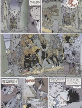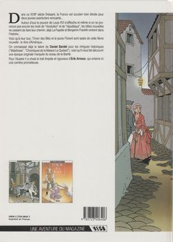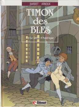 remarques: | 1er volet de la série dans un XVIIIe siècle finissant, la France est soudain bien étroite pour deux jeunes aventuriers agités... autour d'eux, le pouvoir de Louis XVI s'effiloche et, même si l'on ne prononce pas encore les mots "Révolution" et "République", les idées nouvelles ne cessent de faire leur chemin déjà Lafayette et Benjamin Franklin entrent dans l'histoire... en compagnie d'Arnoux, Bardet nous fait découvrir une épopée originale marquée du sceau de la liberté résumé Timon, surnommé Timon des Blés, parce que né à la Saint-Timon durant les moissons. Timon quitte sa campagne de Normandie pour Paris, mais en chemin, il tombe sur des brigands et devient lui-même un peu brigand >> p. 19 des brigands de bon renom en truanderie Timon avec son ami Florent deviennent des tire-laines bien ferrés, et arrivé à Paris, Timon entend parler de la réception de Benjamin Franklin par le roi qui va envoyer les troupes de Rochambeau et de La Fayette pour soutenir l'indépendance américaine, ce qui causera le rêve d'Amérique pour Timon accusé de meurtre, Timon n'hésite pas à quitter Paris et à s'engager à Brest dans l'équipage d'un vaisseau en partance pour l'Amérique, l'aventure commence.. et le rêve, le rêve d'Amérique devient réalité à noter: la forme de la narration souvent relativement lourde et reflétant une époque lointaine de la BD, mais surtout en forme de prose ou de poésie, soit un texte sur rime, qui rend la lecture parfois quelque peu lassante, sautant d'une scène à une autre de manière pas toujours très heureuse le fond de l'histoire est peut être bon, mais le style de narration et le découpage sont donc plutôt rebutant ce premier tome paru en 1986 montre ses rides, et malheureusement elles sont assez profondes… tout comme le graphisme, pas encore très mature, avec des paysages aux couleurs délavées et sans dégradé, cela s'améliorera toutefois par la suite |