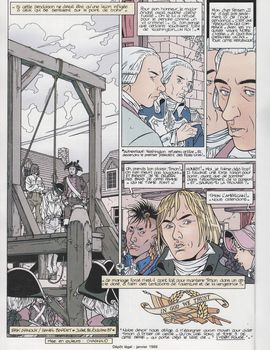remarques: | fuyant la France, courant derrière ses rêves de grandes aventures, Timon arrive aux Etats-Unis clandestinement et devra réussir à se faire accepter par les principaux protagonistes n.b. les insurgents = nom donné aux rebelles patriotes la traversée se déroule monotonement >> et p. 4 le capitaine fait jouer un orchestre sur le vaisseau pour remonter le moral ah que la musique et la guerre forment un bel attelage! 2 mois plus tard, le vaisseau met l'ancre devant Rhode Island >> p. 26 Honest, l'ami indien des français, le fidèle guerrier de la tribu des Creek, un juste et franc coupeur de scalps Timon est enrôlé dans les rifles rouges du colonel Aslop >> p. 30 le scalping d'un indien chicksasaws mais un espion s'est déjà faufilé parmi les troupes françaises, il sera toutefois vite démasqué et condamné à la pendaison alors que Timon est obligé de se marier par contrainte >> le scénario est toujours aussi lourd avec un côté historique plutôt négligé mais le graphisme s'améliore n.b. il parait que certains insurgents auraient voulu faire de Washington un roi, mais celui-ci refusa et deviendra le premier président des Etats Unis |