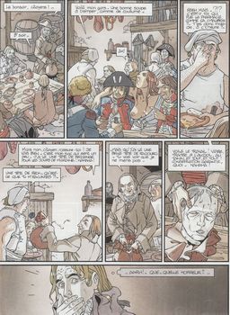 remarques: | avril 1794, quelque part en Normandie, un couperet tombe, otant une vie… dans sa ferme sur l'île de Jersey, "Tim Ashwood" alias Timoleon de la Fresnaye = ashwood = forêt de fresnes ignore encore que l'homme qui vient de mourir, va, par sa qualité et sa mort même, le contraindre à rompre la quiétude dans laquelle il vit depuis près de 12 ans avec sa nouvelle femme Marion et son fils William, depuis son retour des Amériques, pour l'obliger à replonger dans son passé. Timon apprend que le guillotiné est en fait son père adoptif et que lui Timon est l'héritier du titre et du domaine mais entre Timon et son héritage, il y a la Terreur >> p. 18 l'auberge du bon buveur et où est présentée la tête du père de Timon, "traitée à l'alcool, au tanin et tout et tout, conservation garantie" en France, la terreur est à l'ordre du jour, la république traque sans merci ceux qu'elle appelle ses "ennemis intérieur", une série de meurtres s'abat sur la Normandie c'est Timon masqué qui sous le couvert de manteaux noirs, dirige une société secrète dont il utilise pour venger son père mais traqué par les bleus, Timon doit s'enfuir à nouveau >> p. 40 la torture par huile de ricin >> propulsant leurs personnages dans un nouveau cycle, sous la lumière crue de la révolution, Bardet et Arnoux trouvent ici un souffle nouveau en donnant de leur héros, Timon une vision inattendue,. et nous avons affaire ici à un album un peu meilleur que les précédents non dans le fond mais dans la forme une fois encore, un peu plus concis, une trame mieux maitrisée, moins de distorsions spatio-temporelles mais toujours encore avec un scénario plutôt lourd alors que le graphisme, mêlant sexe et violence, reste toujours agréable à l'oeil à noter p. 9 le chien qui égorge une oie |