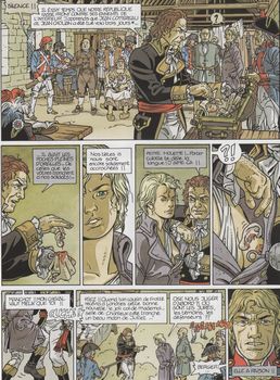 remarques: | avril-Juillet 1794, bien des évènements sanglants ont à Paris transfiguré la révolution, ne lui donnant désormais qu'un seul maitre, Robespierre et la "veuve" ne manque pas de travail! la terreur s'amplifie, en Normandie, proche de l'Angleterre, des colonnes de bleus pourchassent les manteaux-noirs. si Timon continue d'y mener, non sans panache, un combat inégal, ne se retrouve t-il pas en présence d'un vieil acharné ennemi, rencontré jadis au temps du rêve d'Amérique ? et quelle personnalité se dissimule derrière l'innocent et poétique sobriquet de …"la mouette" la Terreur règne aussi dans le bocage normand, un dénommé Bergier, nouveau représentant du comité de sureté, avec la main gauche amputée, y arrive en mission spécial >> p. 17 le bocage normand la "Mouette" une femme travestie en homme fait aussi son apparition alors que Timon, pourchassé par les bleus, réussit à s'échapper, la Mouette se fait capturer >> entre actions, érotisme, amour, le récit bascule constamment d'un état à un autre, de la douceur des caresses à l'atrocité la plus crue, les morts s'enchainent et la rancœur semble avoir trouvée fidèle portes paroles toutefois le scénario reste toujours encore lourd à la lecture, on ne s'y retrouve pas toujours dans le bocage normand! quant au graphisme, le style du nouveau dessinateur Klimos ne change guère par rapport à celui d'Arnoux mais reste toujours encore respectable |