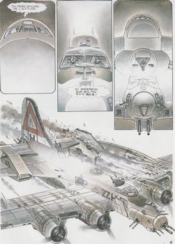 remarques: | Titania est à mettre en relation avec Mutante, même genre d'ambiance et de thématiques qui se recoupe, les deux formant un diptyque, du coup, même conclusion que pour le tome mutante, à réserver toutefois aux inconditionnels de Juan Gimenez album comportant plusieurs épisodes de SF fantastique: 1) Primabell >> p. 1 création de la poupée érotique Primabell qui provoque des neuro-orgasmes, mais qui est aussi une bombe sexuelle 2) do it yourself par accident, un joueur de video game est projeté dans un monde de réalité 3) Antoinette deux soldats révolutionnaires du futur sont projetés en début de révolution dans le vagin d'Antoinette d'Autriche, épouse de Louis XVI 4) compartiment des hommes du futur exécutent des opérations dans le passé, cette fois dans un train de 1953 5) entropie (état de désordre d'un système) des escadrilles de bombardiers de la deuxième guerre mondiale sont agressés par des engins volants futuristes >>> p. 34 le bombardier Big Pig 6) duel le secret du shérif qui dégaine plus vite que son ombre cosmique (un thème bien connu) 7) distorsion exploration futuriste dans un passé égyptien de 6000 B.C. >>> de courtes nouvelles de SF fantastique assaisonnées à toutes les sauces, c'est tortueux et difficile à la compréhension, en gros, le thème, c’est les causes à effets des voyages dans le temps et ce qui est vraiment digne d’intérêt, ce sont les dessins qui sont sublimes Juan Giménez est l'un des plus grands dessinateurs de science-fiction, ses talents de visionnaire sont remarquables, et surtout son dessin est d'une grande finesse, d'une subtilité renversante et ses couleurs, éblouissantes il y eut trois éditions pour cet album, 1987, 1989 et 1993,. il s'agit ici de l'édition 1993 avec une nouvelle couverture d'album "dragoon gay" annexes - couverture et extraits de l'album - couverture de l'édition originale |