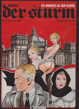remarques: | der Sturm peut se traduire par "tempête" et c'est bien d'une tempête dont il s'agit. nous sommes le 27 janvier au soir et un homme mourant frappe à la porte de Jan Karta et s'effondre, avant de mourir il a le temps de prononcer une phrase énigmatique:"le Hollandais, c'est le Hollandais ...les ennuis de notre détective privé ne font que commencer. à cette date, le maréchal président von Hindenburg n'a pas encore nommé Hitler chancelier, le vieil homme le déteste et le surnomme "le caporal bohémien", mais le parti nazi est le plus puissant du Reichstag et les SA font la loi dans les rues allemandes. manipulé, vieilli et malade Hidenburg nomme toutefois Hitler au poste de chancelier le 30 janvier., mais Hitler ne peut pas gouverner comme il l'entend, socialistes ett communistes lui mènent la vie dure au parlement puisque les deux groupes confondus ont davantage de députés que les nazis. Hitler arrache à Hidenburg la dissolution du parlement, de nouvelles élections sont prévues pour début mars., mais là encore la victoire nazie reste aléatoire, à moins qu'un événement ne précipite les choses, cet événement sera l'incendie du Reichstag dans la nuit du 27 février. Hitler met l'attentat sur le dos des communistes et fait arrêter le lendemain plus de 4000 militants, mais malgré cela si les nazis remportent les élections, ils n'ont toujours pas la majorité absolue, ce n'est que le 23 mars que le Reichstag vote les pleins pouvoirs à Hitler, grâce à l'appui du DNVP petit parti de droite qui n'avait obtenu que 8% des suffrages, théoriquement ces pleins pouvoirs ont une durée de 4 ans mais on connaît la suite ... 3 jours plus tôt le premier camp de concentration à Dachau était ouvert, l'enfer vient de s'inviter en Allemagne et bientôt en Europe, par son aspect pyschologique l'incendie du Reichsta a eu un rôle sinon déterminant au moins très important. reste à savoir si ce n'était pas une manipulation pure et simple des nazis. c'est cette histoire qui nous est contée en partie dans cette nouvelle enquête de Jan Karta Berlin 1933, un homme s'écroule dans l'appartement de Karta et meurt, il prononce les mots, le hollandais et laisse à Karata quelques adresses Karta est interrogé officiellement par l'inspecteur Seecht de la Gestapo puis par son supérieur Koofmich qui tente de faire passer Karta du côté des nazis Karta réussit à se disculpler et est relâché >> p. 16 la jeune femme chassée par Karta et laissée sur la rue en sous-vêtements, par gentil cela, Monsieur Karta!! >>p. 22 Rudolph, le copain journaliste de Karta la première adresse conduit Karta à la brasserie Sturm Bier où Karta se fait copieusement tabasser mais il a la chance de se faire soigner par une jolie serveuse la prochaine visite le mène au bordel de maman Marlène >> p. 35 maman Marlène = un homosexuel nazi >> p. 42 les cauchemars sanglants de Karta par la suite grâce à ses hypothèses bien imaginées, Karta découvrira qu'il s'agit d'un complot nazi pour incriminer un hollandais, plutôt innocent, dans l'incendie du Reichstag >> p. 56 dernière page avec les portraits des personnages impliqués dans l'affaire du Reichstag >> cette fois l'enquête de Kara est plutôt banal avec un graphisme qui ne change guère et une couverture d'album insolite |
