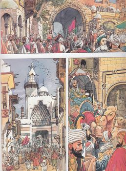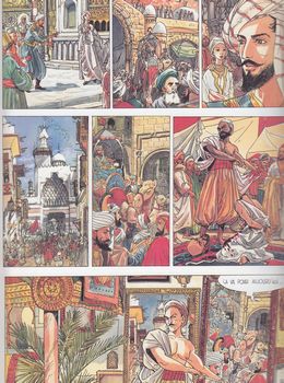 remarques: | récit composé en 4 parties: 1/ Djemilah Alger 1836, 6 ans après l'occupation française, le jeune peintre, Joseph Constant, y débarque en faisant des notes et des croquis dans ses carnets, il y rencontre son oncle Mario qui fait le portrait des officiers et de leurs femmes >> p. 15 la visite du harem et lors d'une visite d'un harem, Constant tombe amoureux de Djemilah, une jeune femme arabe 2/ une promenade militaire Constant apprend l'arabe et le Coran, il rencontre en secret la jeune femme Djemilah >> p. 23 l'humiliation pour un jeune arabe Djemilah est conduite par son maître à Constantine, Constant se joint à l'armée française qui va assiéger Constantine, mais l'offensive échouera n.b. mention du célèbre chef Youssouf qui est auxiliaire dans l'armée française >> p. 24 l'arrivée du chef Youssouf >> p. 28 le supplice de la crapaudine 3/ les jardins où coulent les fleuves les enfants que les turcs ont engendré avec des femmes arabes sont appelés les "couloughis", mais maintenant les anciens oppresseurs turcs ont été en grande partie massacrés la paix revenue, Constant retourne à Constantine en se faisant passer pour un émissaire de Abd-el-Kader; là, il apprend que Djemilah est morte de maladie 4/ passion d'Afrique les hostilités ayant repris, Constant est fait prisonnier, mais il est délivré par son oncle déguisé en chef arabe, Constant retournera en France et commençera à peindre ses fresques d'Orient d'après ses carnets de route dont le fameux tableau du harem en fin d'album glossaire de termes arabes dont: - agha = dignitaire de haut rang, maître, seigneur - bey = mot turc désignant un dignitaire, vassal du sultan - caïd = chef de tribu - chaouch = sergent de l'armée turque - émir = chef, prince, commandeur des croyants - imam = prêtre musulman - oukil = partisan d'Abd el Kader - raïs = nom turc donné aux capitaines de corsaires de la Régence d'Alger - roumi = déformation de romain, nom donné aux européens - sourate = chapitre du Coran >> le début d'une série intéressante tant pour le scenario que pour le graphisme particulier (genre aquarelle) avec un très beau coloriage, le tout additionné de nombreux notes et croquis Information avec la série carnets d'Orient, Jacques Ferrandez raconte l'histoire de l'Algérie, depuis sa conquête en 1836, jusqu'à son indépendance à la fin des années 50 dans le prochain album "l'année de feu", nous suivons le lieutenant Victor Barthélémy, qui après la guerre contre les prussiens, se retrouve propriétaire d'un domaine en Algérie, il quitte alors la France avec sa femme pour prendre possession de ses nouvelles terres, depuis longtemps, sa femme rêves de ce pays, son soleil, ses paysages, son exotisme... malheureusement pour eux, leur vie sur place sera surtout marquée par la révolte, le feu et le sang l'œuvre retrace la présence française en Algérie entre 1836 et 1962, à travers les portraits de plusieurs protagonistes dans leurs actes quotidiens, la vie du peintre orientaliste fictif Joseph Constant forme l'une des trames de la narration dans cette série où se côtoient bande dessinée, aquarelles et esquisses en 1986, les bandes dessinées abordant le sujet de la guerre d'Algérie sont rares: - le premier récit long est publié en 1982 (une éducation algérienne de Guy Vidal et Alain Bignon), ce sujet n'est guère abordé dans l'art, d'autant que l'état français attend 1999 pour reconnaître officiellement que les "opérations de maintien de l'ordre" étaient une guerre d'indépendance, Ferrandez choisit de ne prendre parti ni pour un camp ni pour l'autre, il s'attache à transmettre le point de vue de ses différents personnages: ceux des indigènes et des colons, des militaires et des fermiers, des arabes, des chrétiens ou même des juifs carnets d'Orient est bâtie sur une recherche historique, iconographique et documentaire très fouillée |
