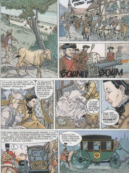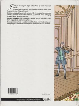 remarques: | album EO, juin 1989, 48 pages dessinateur: Norbert Morandière, alias Norma scénariste: Patrick Cothias il était une fois une jeune et jolie archiduchesse qui aimait un sémillant musicien, la belle se prénommait Maria Antonia Joseph Jeanne de Lorraine et son fougueux courtisan Wolfgang Amadeus (Johan Chrysostomus Wolfgang Gottlieb Mozart) l’histoire n’a pas gardé trace de cette romance elle n’a reconnu que les noms de ces amoureux au cœur tendre: Marie-Antoinette, future reine de France et Wolfgang Amadeus Mozart, prince des musiciens, l'archiduchesse était destinée à être mariée au roi de France, une pendule qui se trouve dans la chambre de Marie-Antoinette raconte à sa façon la vie de celle qui finira, 25 ans plus tard, sur l’échafaud 1770, au palais de Schönbrunn, la jeunesse de Maria Antonia, fille de François Ier, empereur germanique, époux de l'impératrice autrichienne Marie-Thérèse, reine de Hongrie et de Bohème mais pour gouverner, c'est la reine qui porte la couronne n.b. petit résumé de la guerre de succession d'Autriche (1740-1748) et à la fin de la guerre, pour s'assurer une alliance France-Autriche, Marie-Thérèse accorde la main de Marie-Antoinette au dauphin de France, le futur Louis XVI (1754-1789), petit-fils de Louis XV >> ses parents sont Louis de France (1729-1765) fils de Louis XV (1715-1774) et de Marie Leszczynska toutefois une communauté appelée "les nouveaux chevaliers du temple teutonique", (n.b. cette communauté est de pure fiction, n'ayant jamais existé) proche de la Prusse,s'oppose à ce mariage et cherche par tous les moyens à discréditer la future reine de France >> p. 10 début de la fameuse pendule à souvenirs la puberté de Maria-Antonia étant atteinte, le roi de France est averti que le mariage peut être célébré et avec ce mariage, un nouvel équilibre va s'imposer en Europe: d'un côté la France, l'Autriche, l'Espagne et l'Italie, de l'autre côté la Prusse, la Russie et l'Angleterre >> p. 22 première tentative d'assassinat sur Maria-Antonia lors d'un bal masqué >> p. 39 la sélection des valets de pied = homme à tout faire, lorsqu'il est en livrée, c'est un laquais (livrée = costume distinctif que portent certains domestiques) >> p. 40 le départ de l'archiduchesse pour la France le cortège constitué de 57 voitures, 370 chevaux et de 132 dames d'honneur et autres personnages ainsi que la pendule qui fait partie du voyage n.b. deux fourgons contenaient une chambre à coucher complète et à Strasbourg, Maria-Antonia, devient Marie-Antoinette n.b. prater = grande étendue verte au sein de la ville de Vienne, située entre le Danube et le canal du Danube >> un bon début pour cette série, texte et graphisme très honorables Information 1/ Marie-Antoinette de Habsbourg-Lorraine (Vienne, 2 novembre 1755 – Paris, 16 octobre 1793), archiduchesse d’Autriche, princesse impériale, princesse royale de Hongrie et de Bohême, est la dernière reine de France et de Navarre (1774-1792) Fille de l'empereur François Ier et de Marie-Thérèse d'Autriche, reine de Hongrie et de Bohême, arrière-petite-fille de Philippe d’Orléans, le 16 mai 1770, elle épouse Louis XVI, alors dauphin de France, puis roi de France et de Navarre Marie-Antoinette est la quinzième et avant-dernière enfant de l’empereur François Ier de Lorraine et de l’impératrice d’Autriche, reine de Hongrie et de Bohême, Marie-Thérèse dite "la Grande", au milieu de leurs cinq fils (Joseph l’héritier du trône, Léopold, Charles, Ferdinand et Maximilien) et de leurs huit filles (Marie-Anne, Marie-Christine, Marie-Élisabeth, Marie-Amélie, Marie-Jeanne, Jeanne-Gabrielle, Marie-Josèphe et Marie-Caroline) L'archiduchesse, prénommé Marie-Antoinette-Josèphe-Jeanne, naît le 2 novembre 1755, au palais de la Hofburg, à Vienne ses parrain et marraine sont le roi Joseph Ier de Portugal et son épouse la reine Marie-Anne Victoire d'Espagne on apprend quelques jours plus tard qu'un tremblement de terre a ravagé Lisbonne la veille de la naissance de l'archiduchesse, jour des Defunts; d'aucuns y voient, surtout après 1793, un mauvais présage elle est baptisée sous les prénoms de Maria Antonia Josepha Joanna, elle est aussitôt confiée aux "ayas", les gouvernantes de la famille royale et partage son enfance entre le palais de la Hofburg à Vienne et le château de Schönbrunn son enfance est ponctuée de nombreuses rencontres, comme celle avec le tout jeune enfant prodige Mozart dans le Salon des Glaces du palais de Schönbrunn le 13 octobre 1762, ce dernier l’ayant ingénument demandée en mariage à cette occasion, sa mère Marie-Thérèse, comme tous les souverains de l’époque, met le mariage de ses enfants au service de sa politique diplomatique qui vise à réconcilier, après des décennies de guerres, les Habsbourg et les Bourbons, dans le contexte du renversement des alliances et de la fin de la guerre de Sept Ans, et faire ainsi face aux ambitions conjointes de la Prusse et de la Grande-Bretagne. le 16 mai 1770, Marie-Antoinette épouse le dauphin à Versailles, la jeune fille, au physique agréable, est assez petite et ne possède pas encore la "gorge" si appréciée en France, elle est blonde, d'un blond assez soutenu tirant sur le roux, qui, sous la poudre, prend des reflets rosés ses yeux bleu pâle sont un peu trop saillants, son visage, au vaste front bombé, considéré comme trop haut, offre un ovale très allongé, le nez, qui promet d'être légèrement aquilin, offre peu de finesse, la jeune dauphine a néanmoins beaucoup de grâce et une légèreté presque dansante dans sa façon de se mouvoir archiduchesse d’Autriche, arrière-petite nièce de Louis XIV, par sa grand-mère paternelle Élisabeth-Charlotte d'Orléans, duchesse de Lorraine et de Bar, objet vivant du "renversement des alliances" du roi Louis XV, elle attire dès son arrivée l’inimitié d’une partie de la cour de plus, l